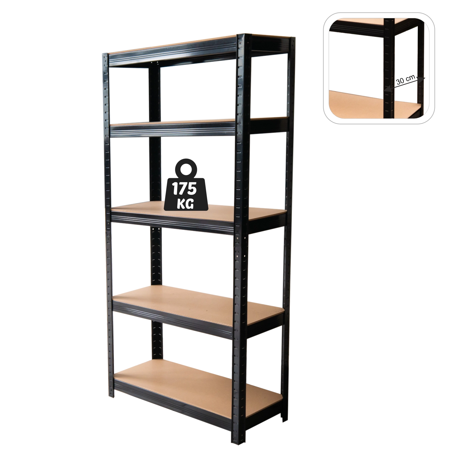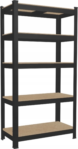 Universal five-shelf unit in black for workshop, garage, and storage. The frame made of galvanized steel profiles and HDF board shelves ensures stability and long service life. Thanks to the braces under each shelf, the unit holds up to 175 kg per shelf (evenly distributed), for a total of 875 kg. Simple assembly without complex tools allows quick setup.