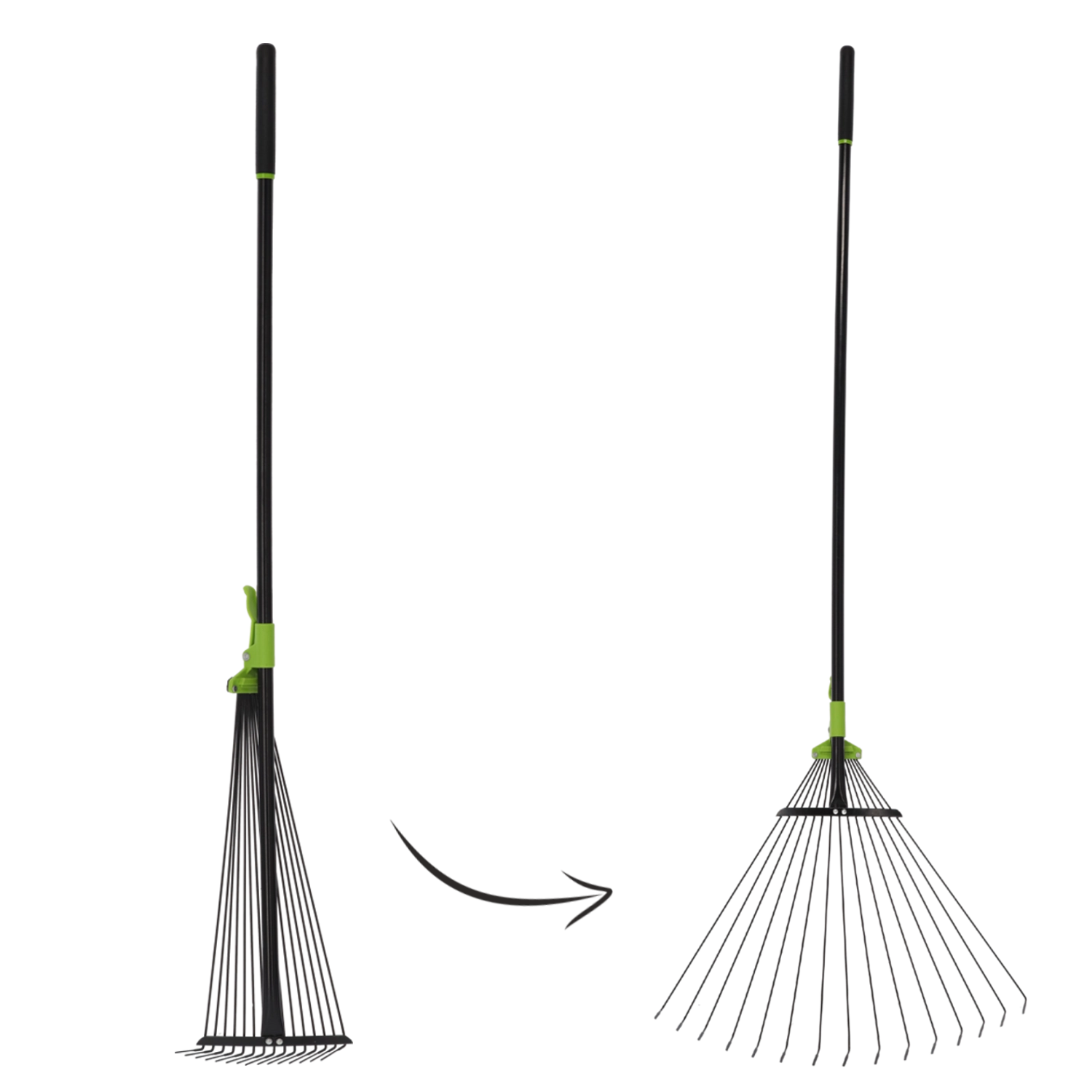 Tidy your garden faster and more comfortably. These adjustable rakes adapt to your height and the space you are working in—from narrow corners to wide areas. The telescopic handle and folding/extendable head save time, space, and your back.