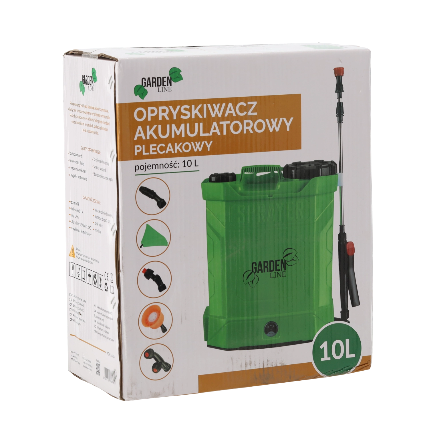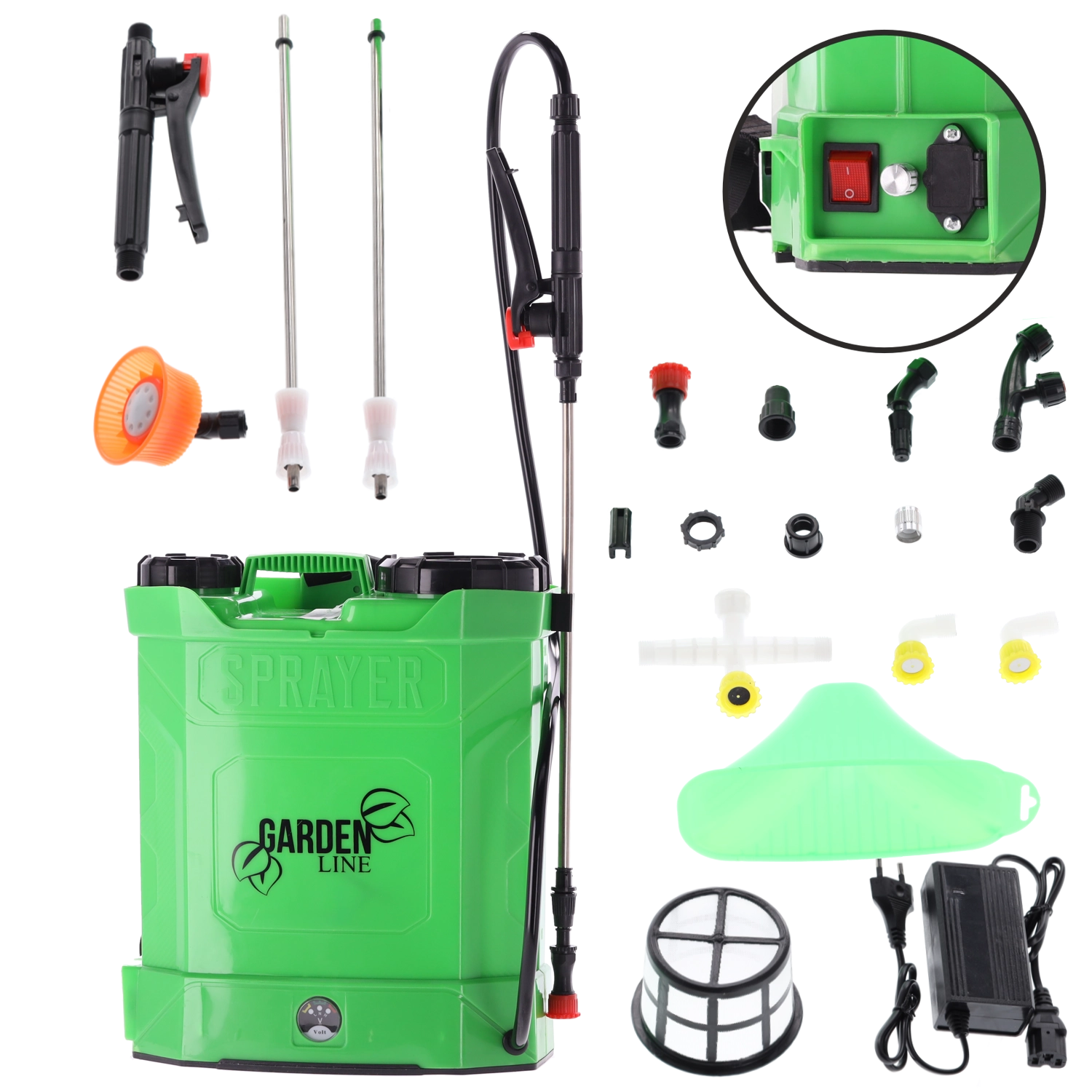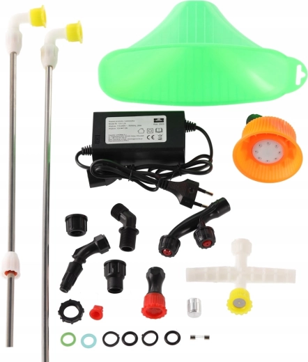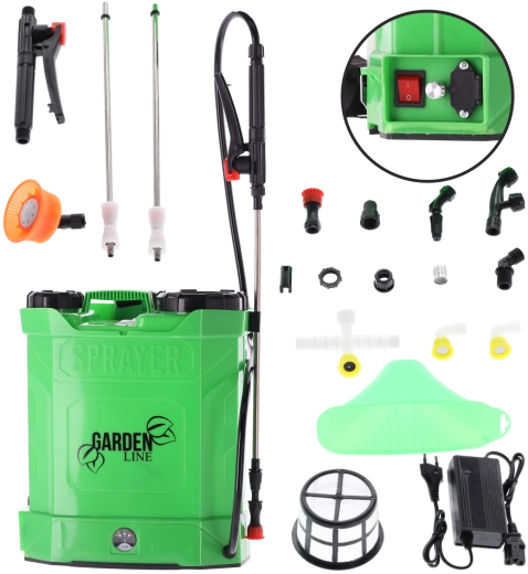 The package includes multiple nozzle types, including misting and sector options, which provide gentle leaf coverage and targeted spraying at height using the metal telescopic lance. The control panel with an ON/OFF switch, a rotary regulator, and a battery status indicator makes precise dosing easy. A filter screen against impurities is also included to protect the pump and nozzles.