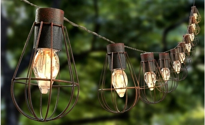 Wire metal cages protect the bulbs and add an industrial look that pairs beautifully with natural wood and brick.