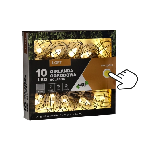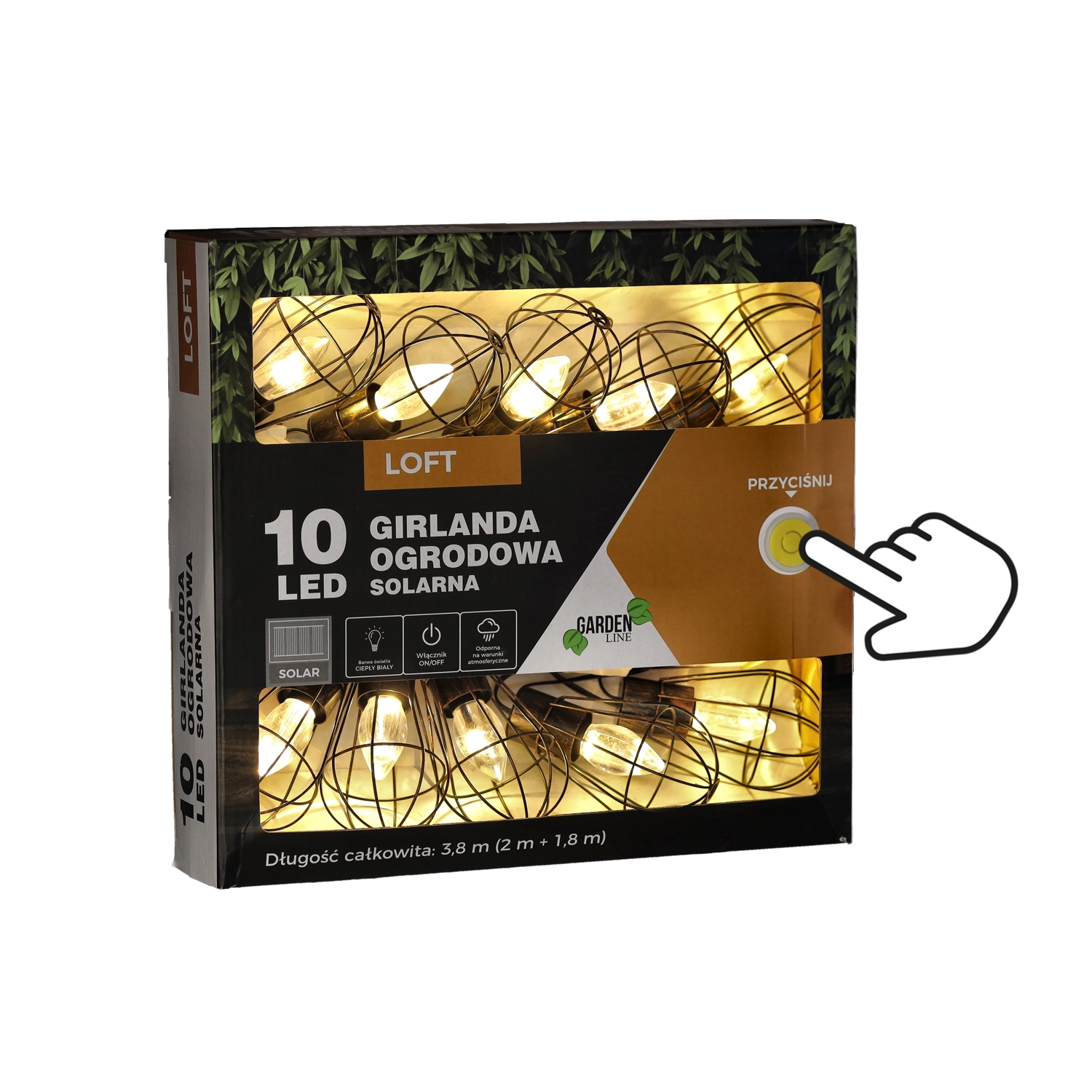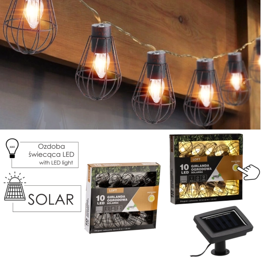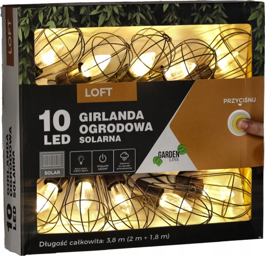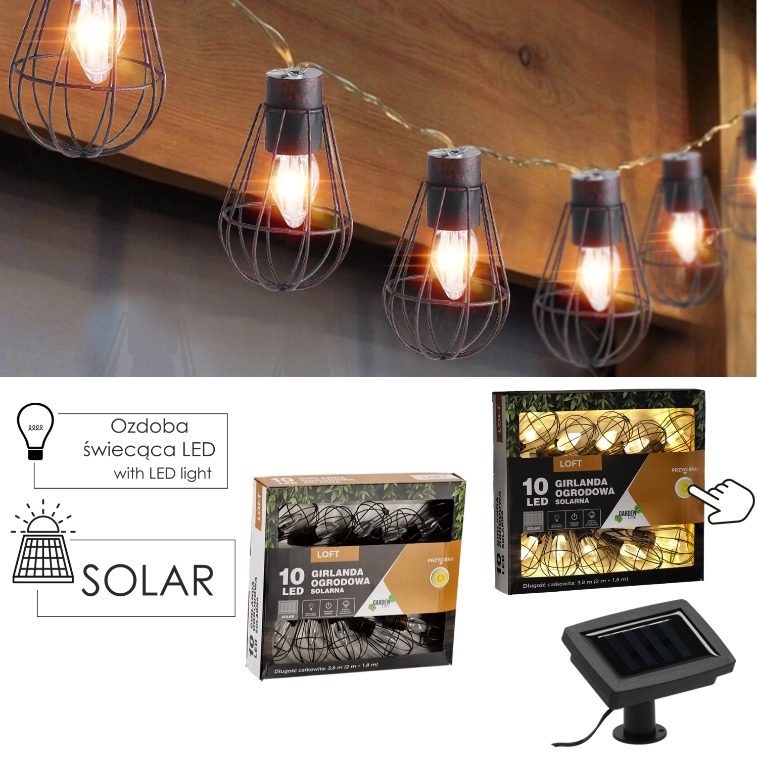 Add a magical atmosphere to your balcony, terrace, or garden with this solar garland in an industrial loft style. 10 LEDs with warm white light shine for up to 6–7 hours after charging, powered by a solar panel with a built-in battery, and thanks to IP44 it withstands rain and moisture. The practical length of 3.8 m (2 m lead-in + 1.8 m light string) and 20 cm spacing between bulbs ensure even, cozy lighting without the need for a socket.