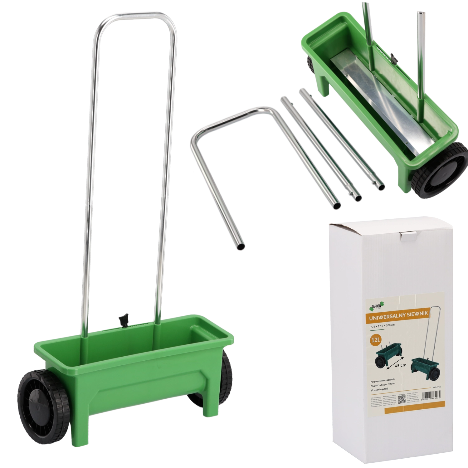 The wide 45 cm coverage and precisely controlled discharge ensure consistent coverage without stripes or gaps—ideal for seed and granular fertilizers.