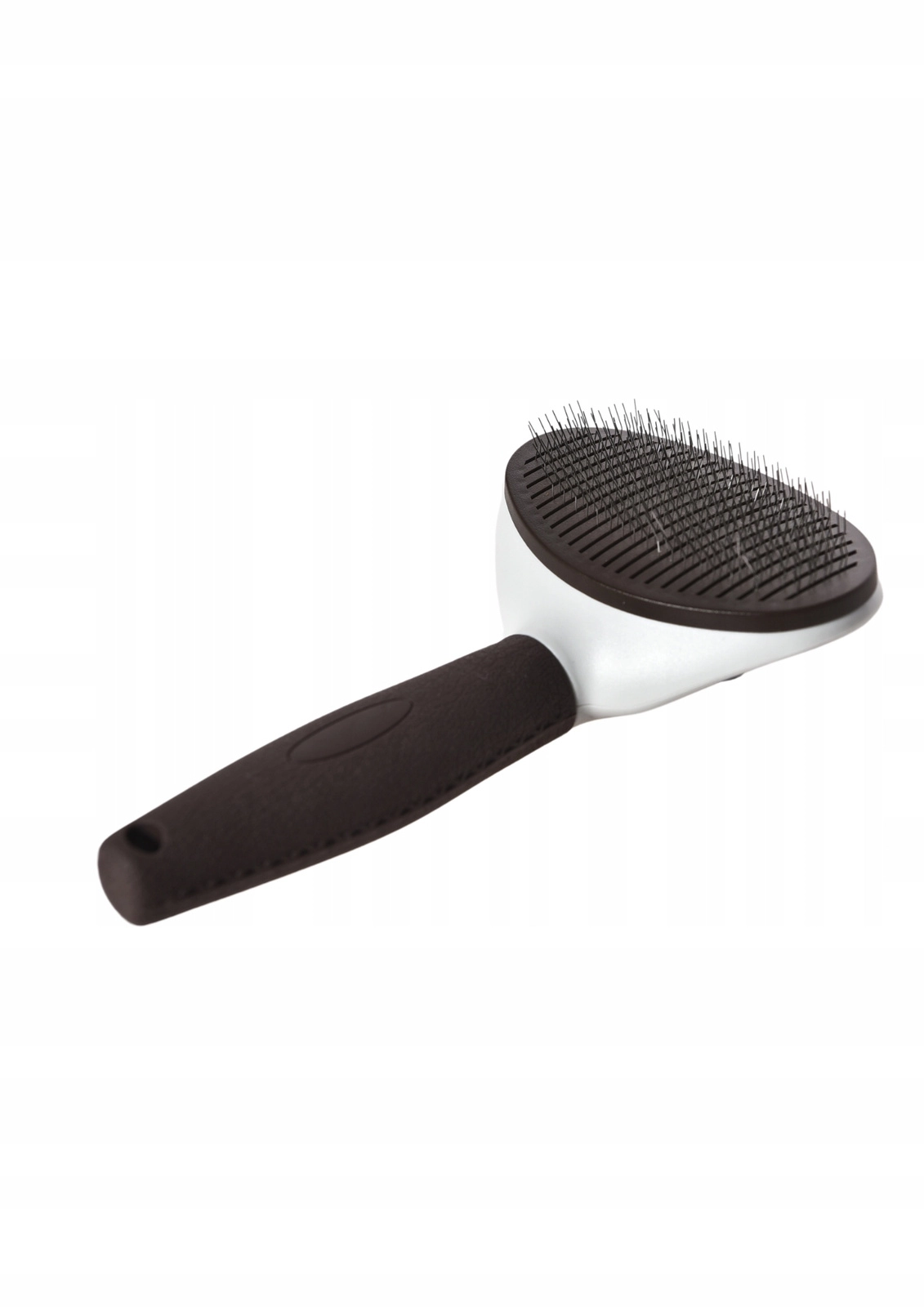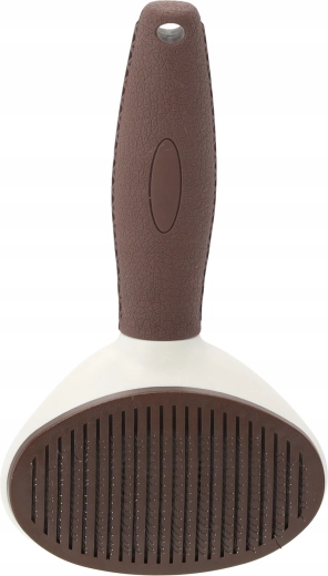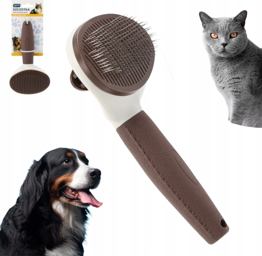 A practical self-cleaning brush for dogs and cats makes daily coat care easier. With a single press of a button, the accumulated fur is released, making cleaning quick and hygienic. Soft wire bristles with plastic tips are gentle on the skin while effectively capturing loose hair and providing a light massage. The ergonomic, non-slip handle ensures a comfortable grip even during longer grooming sessions and helps reduce shedding and improve coat appearance.
