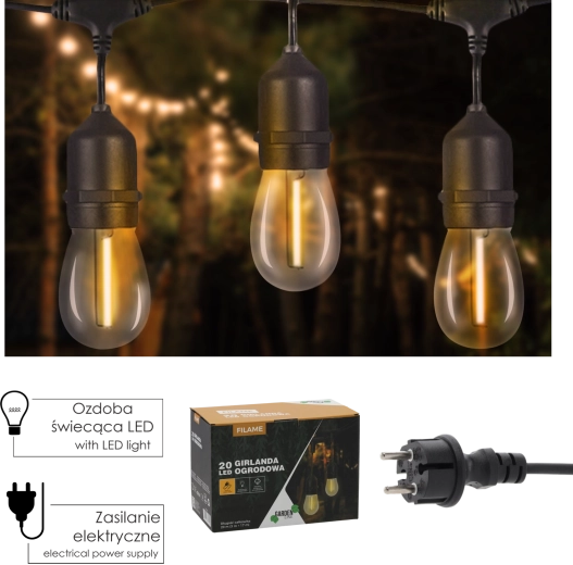 Create a magical atmosphere in your garden, on the terrace or balcony with a 20 m light garland featuring 20 LED E27 bulbs in warm white (3000 K). The IP44 rating ensures outdoor use, the energy-saving 1 W bulbs reduce consumption, and the option to connect multiple sets covers even large areas.