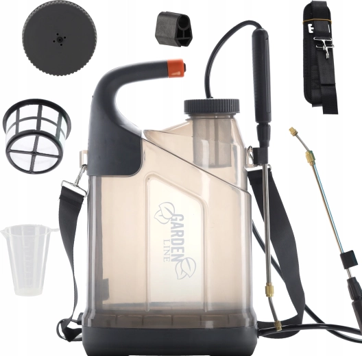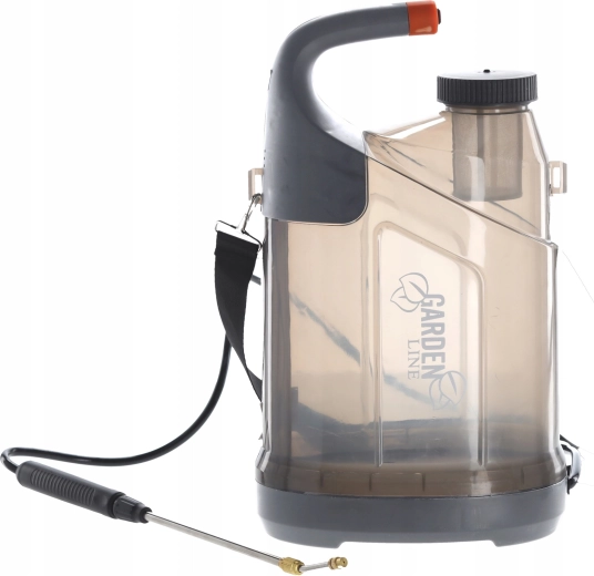 Practical battery-powered sprayer with a 7 l capacity for easy garden maintenance, featuring a comfortable shoulder strap, long spraying lance, and a translucent tank to monitor the fill level. Ideal for plant protection, fertilizer application, and watering in greenhouses, beds, or lawns. Offers steady pressure, long spray reach, and fast USB charging.