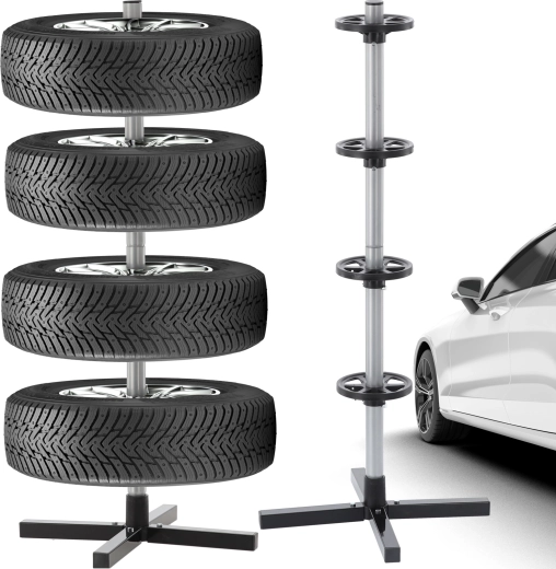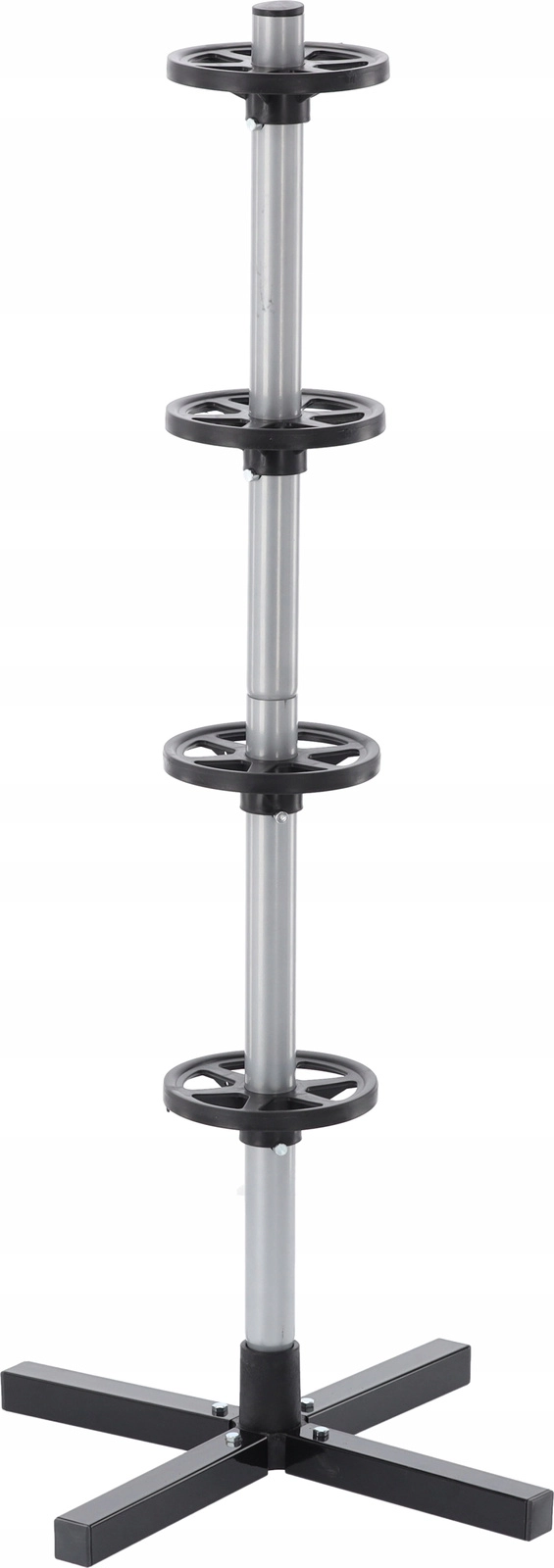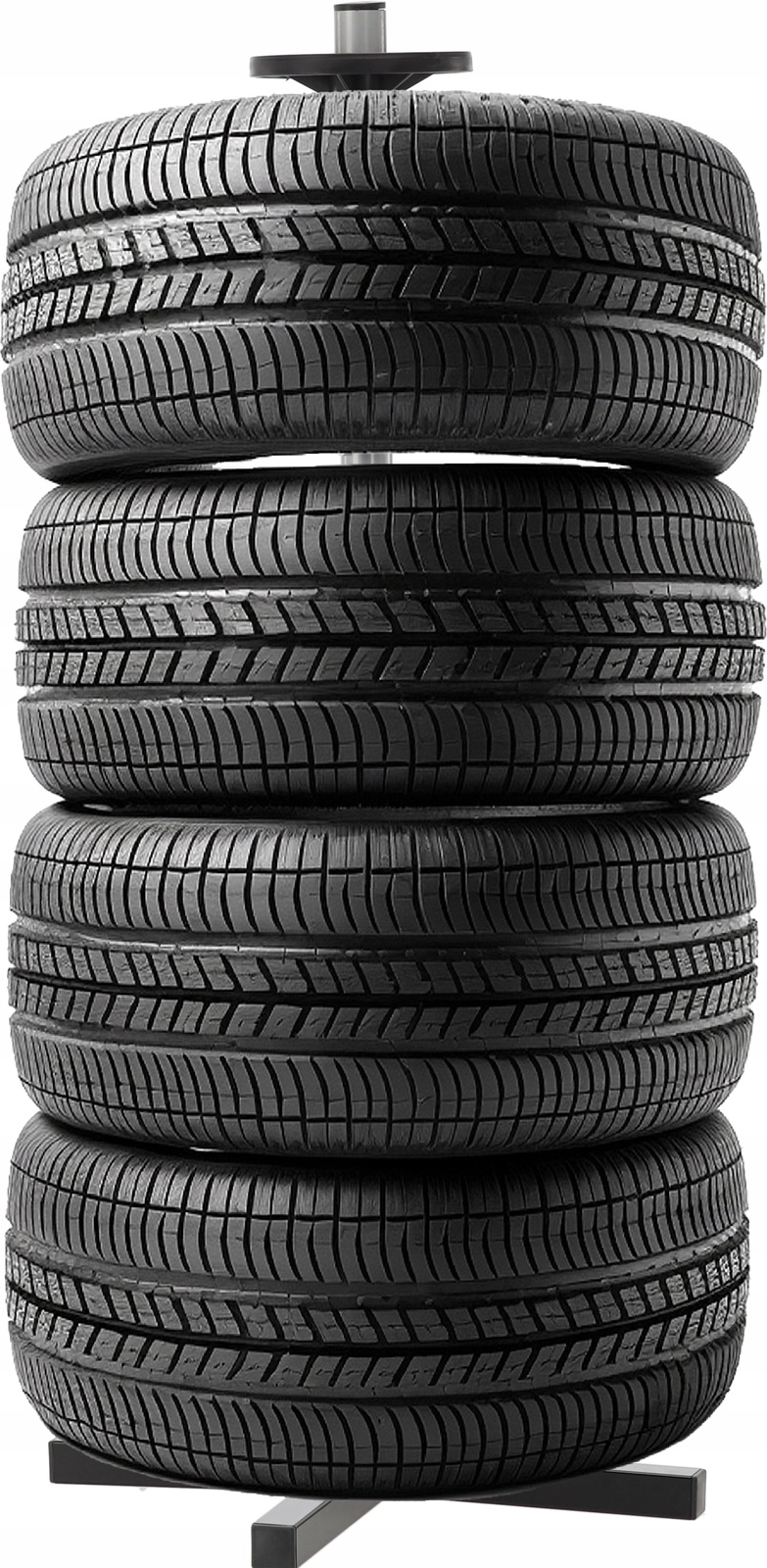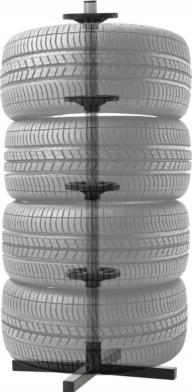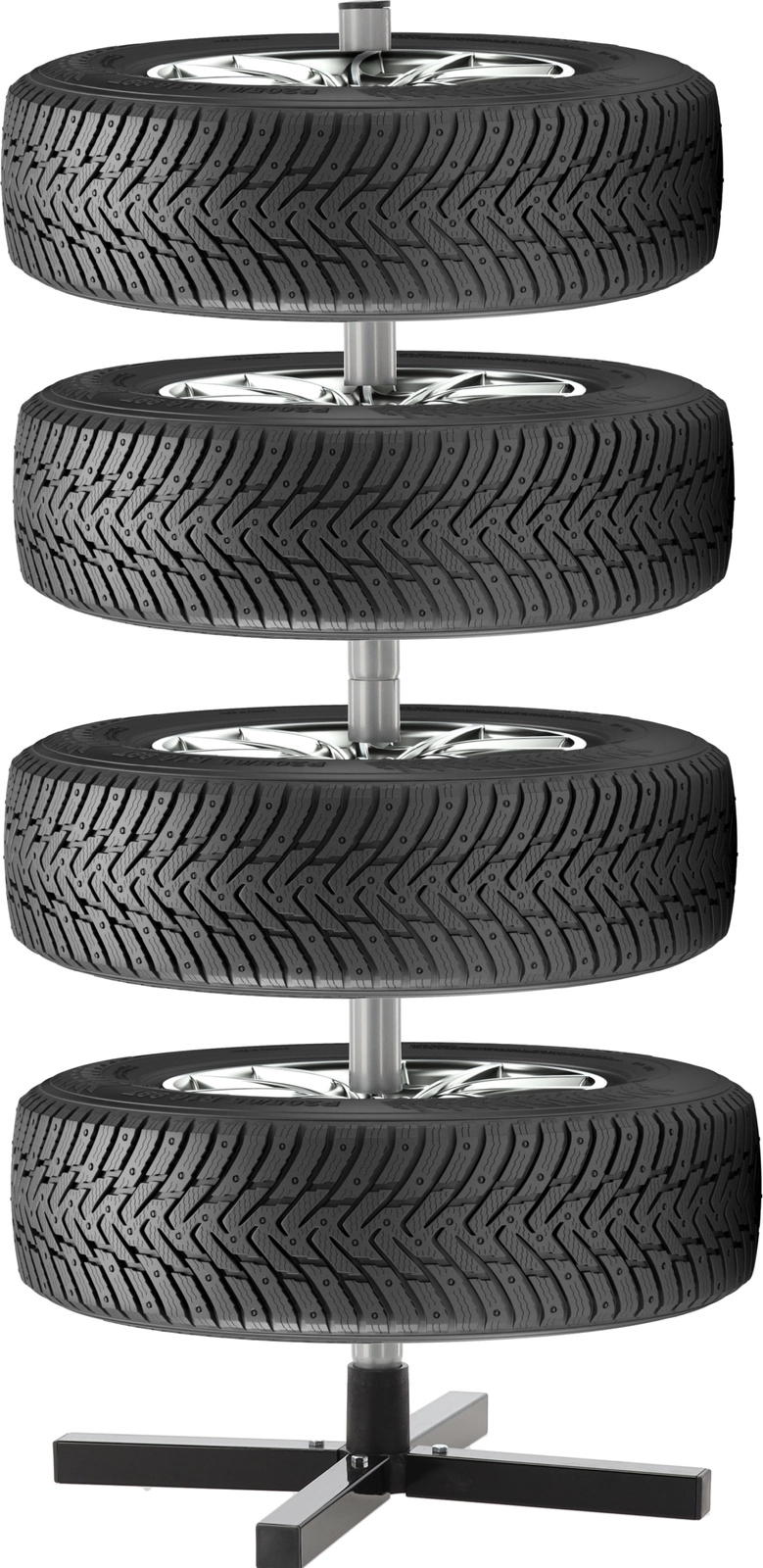 Store your seasonal tire set neatly and safely. The vertical rack with a cross base holds up to four wheels off the floor, saving space and preventing tread flat spots. Durable steel, spacer rings, and a sturdy base ensure stability even at full load.