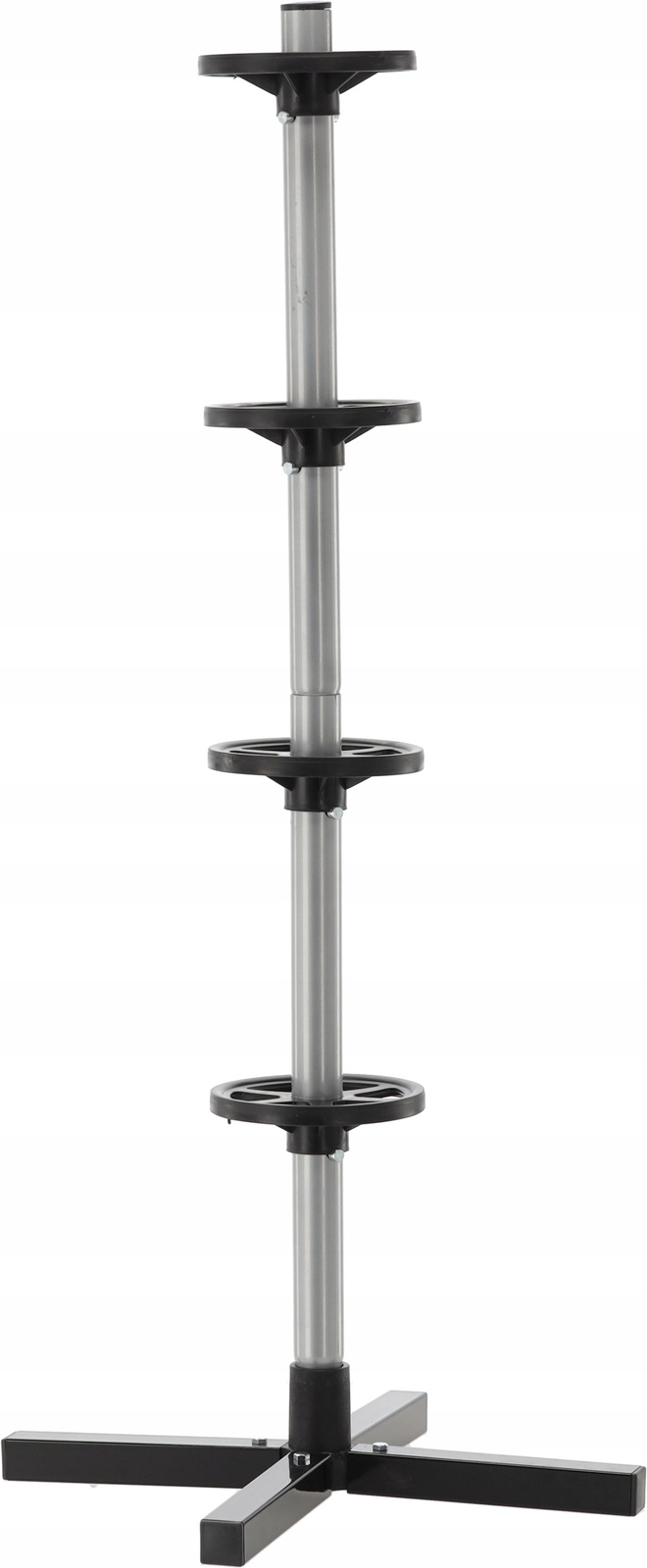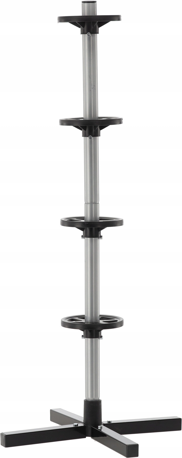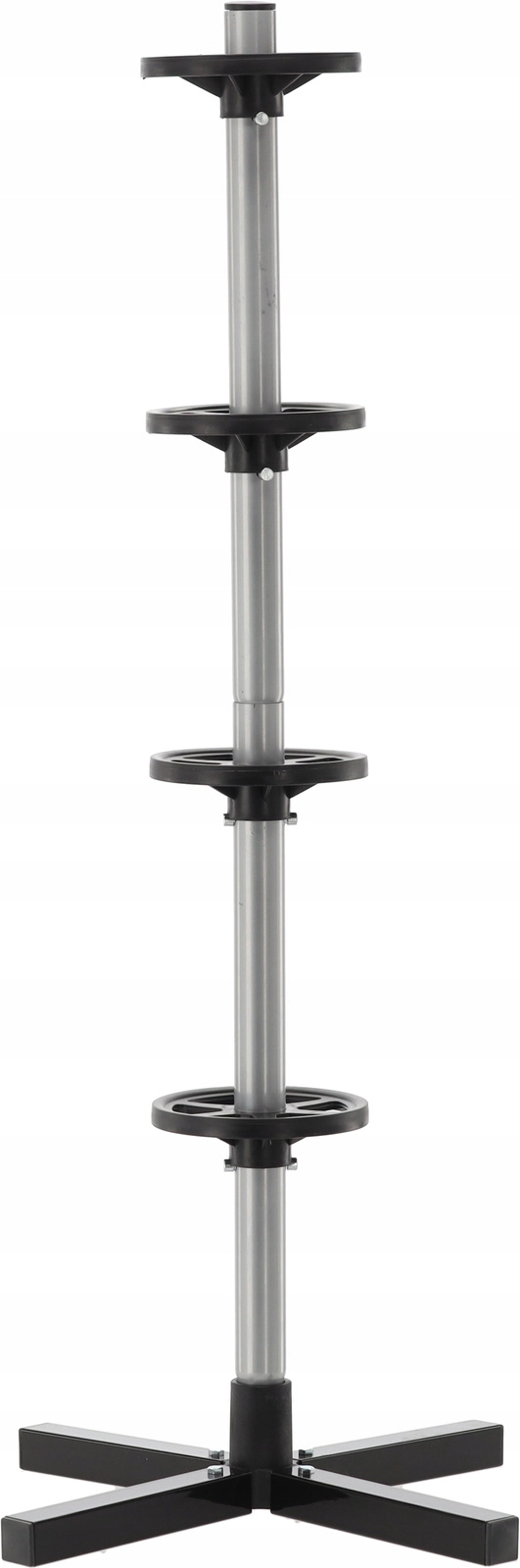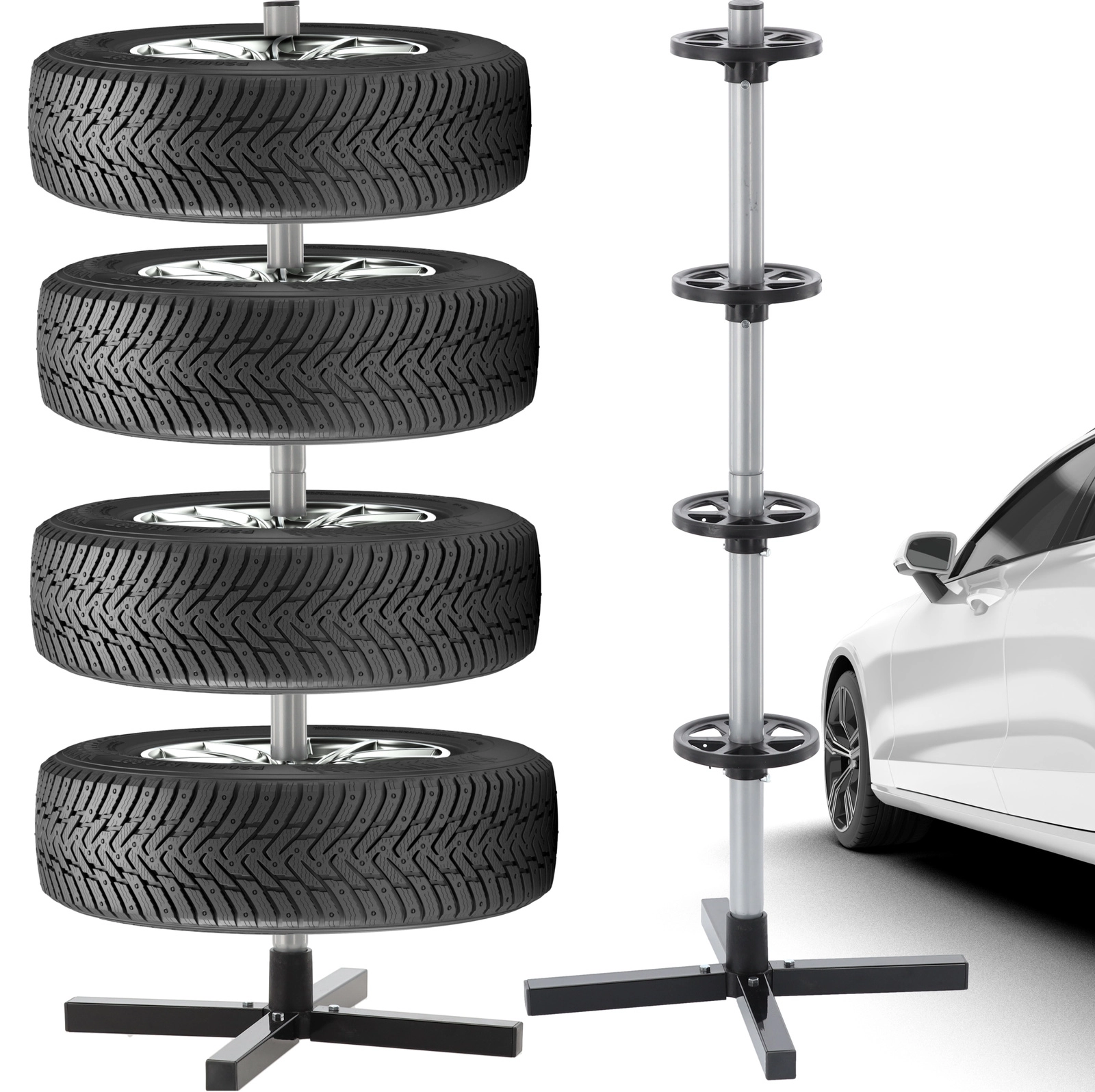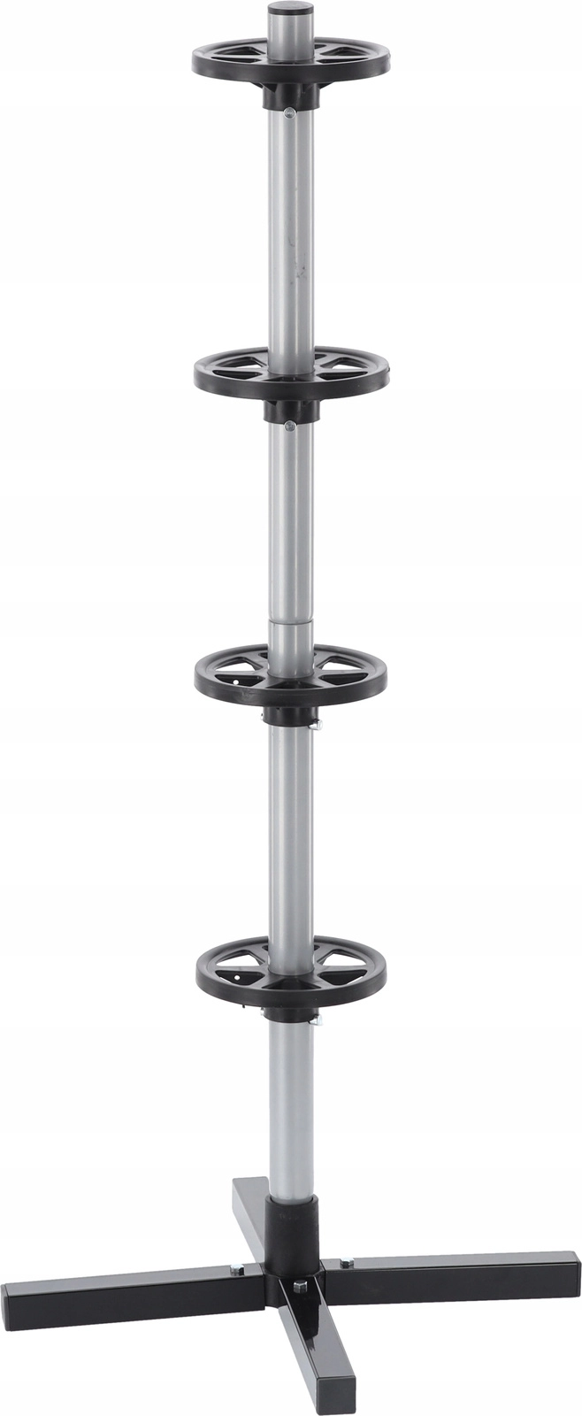 Store your seasonal tire set neatly and safely. The vertical rack with a cross base holds up to four wheels off the floor, saving space and preventing tread flat spots. Durable steel, spacer rings, and a sturdy base ensure stability even at full load.