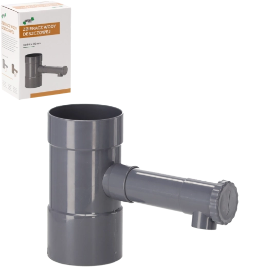 The gray rainwater collector for 80 mm downpipes diverts part of the flow from the gutter pipe into a barrel or reservoir. The robust ABS plastic withstands weather and UV exposure, making it ideal for long-term outdoor use. Installation is quick and requires no complex adjustments.