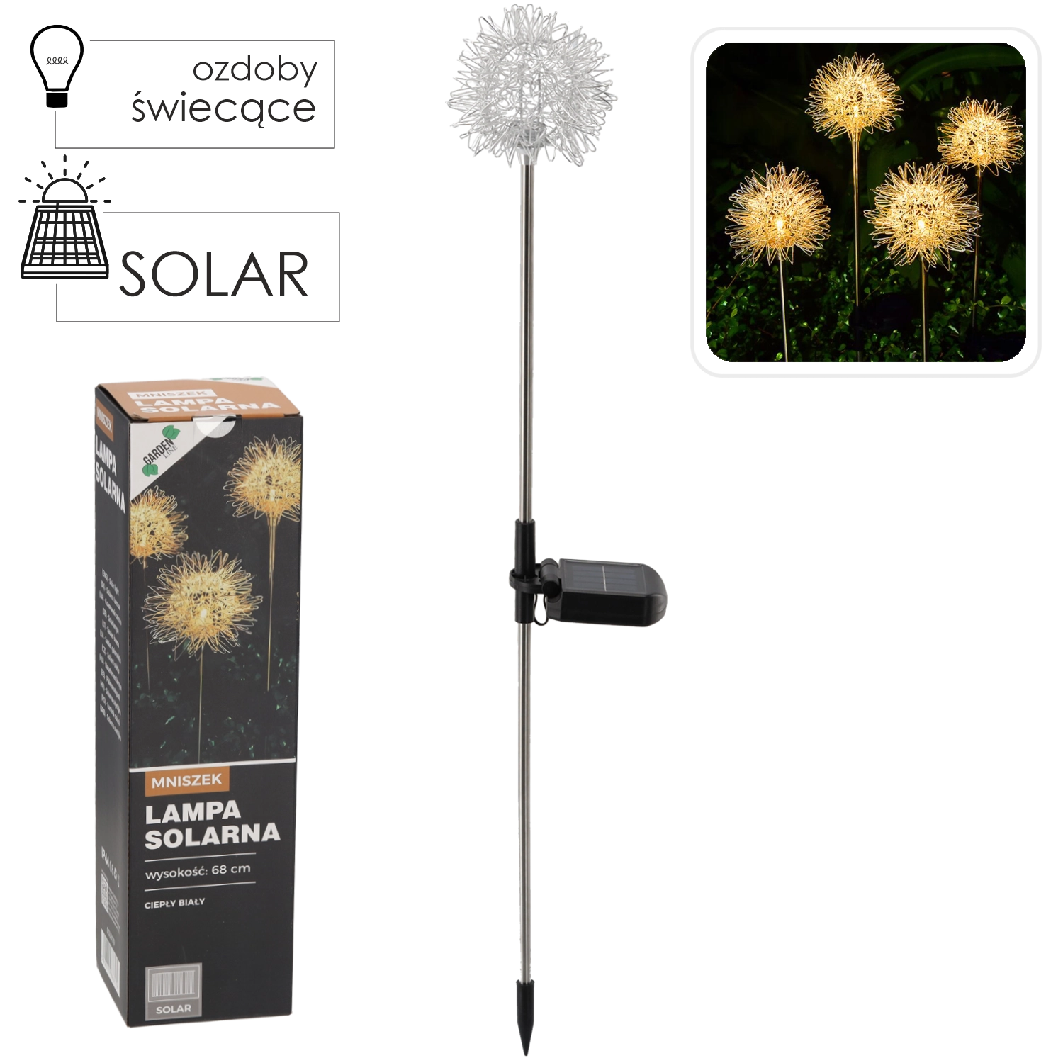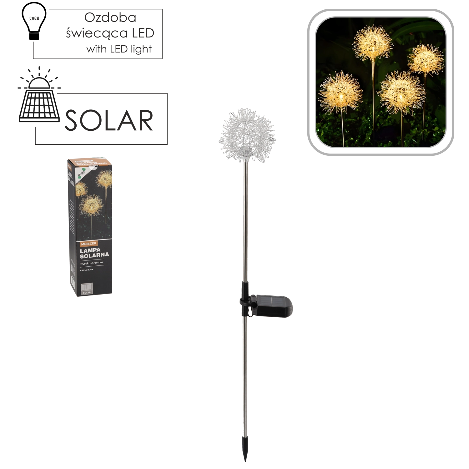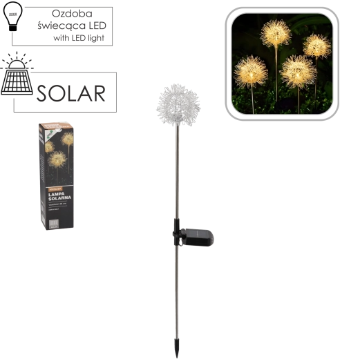 The dandelion-shaped solar lamp, 68 cm tall, brings a gentle ambience and striking decor to your outdoor spaces. The polycrystalline solar panel charges the battery during the day, and after dusk a single warm white LED turns on to create cozy light without electricity consumption.