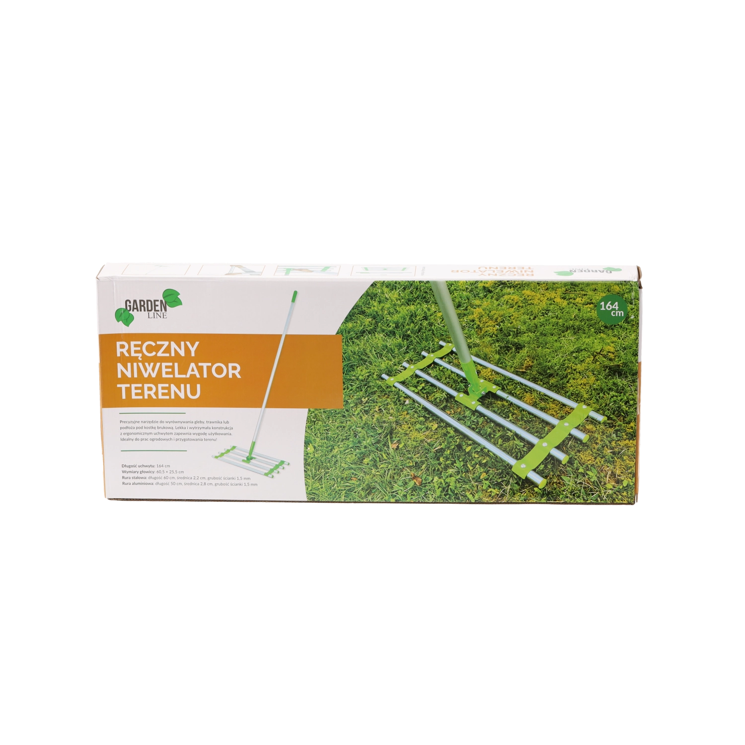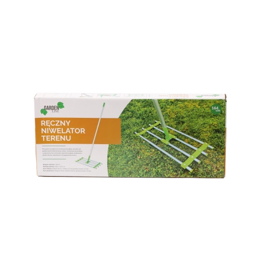 Practical manual landscape leveler with a length of 164 cm for fast and precise leveling of soil, gravel, or sand. Features a robust steel and aluminum construction, a wide head for even pulling, and comfortable handling even during longer tasks.