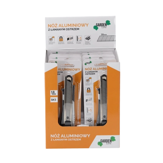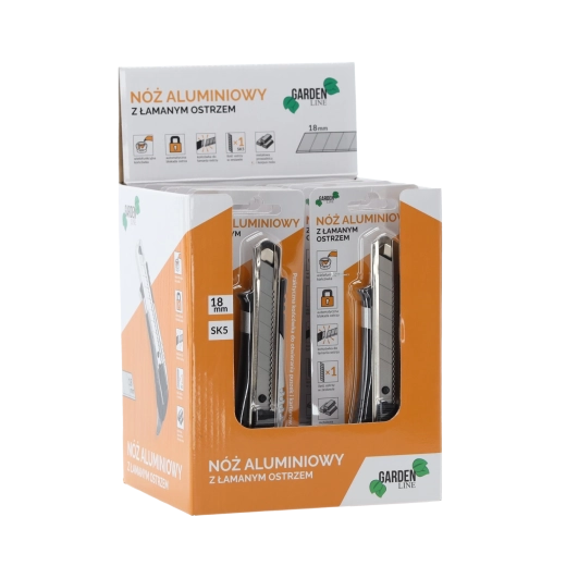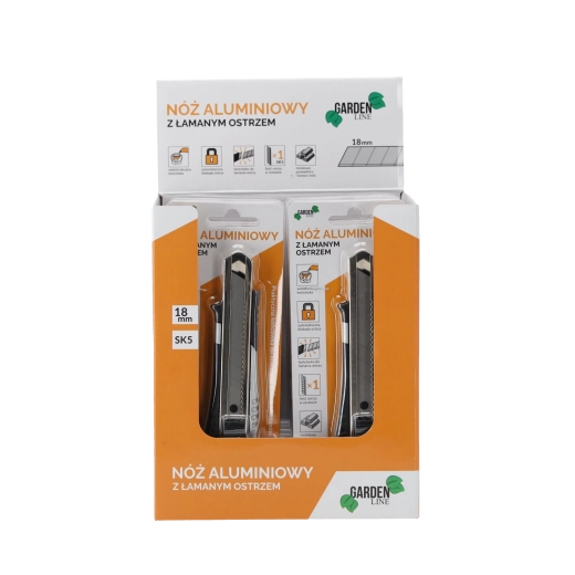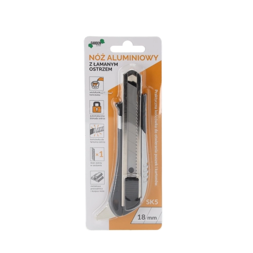 Practical snap-off knife with an aluminum body and 18 mm blade, ideal for precise cuts in the workshop and at home. It features a blade auto-lock for safe operation, a durable aluminum body with a comfortable ABS grip, and an integrated can opener. The tough SK5 steel blade is factory-fitted and ready to use.