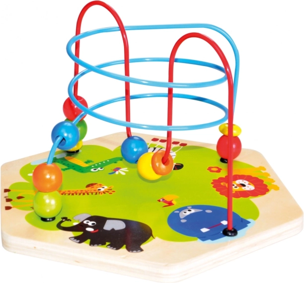 The multi-sided motor skills toy captivates curious children with vibrant colors and a variety of activities enhanced with an educational dimension. Children can guide beads through a maze, count balls, slide animal tiles, turn them and match them with their food, rotate gears, insert blocks, and learn to tell time. The toy is robust, made from thick plywood. Main features: cube with lid and 3 shape sorter pieces; develop spatial and time orientation; match shapes and colors; practice fine motor skills; sturdy wooden design