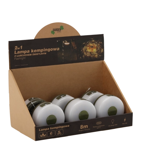 A practical portable camping LED lamp with a hanging hook and a long 8 m light string turns any campsite, garden, or gazebo into a pleasantly lit space. Warm white LEDs create a cozy ambience for gatherings and evening celebrations.