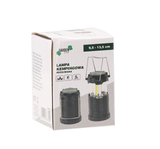 A compact and lightweight camping lamp with a collapsible design for height adjustment from 9.5–13.5 cm. It offers battery-powered mobility, a durable plastic body, and is ideal for camping, tents, the garden, and as emergency lighting.