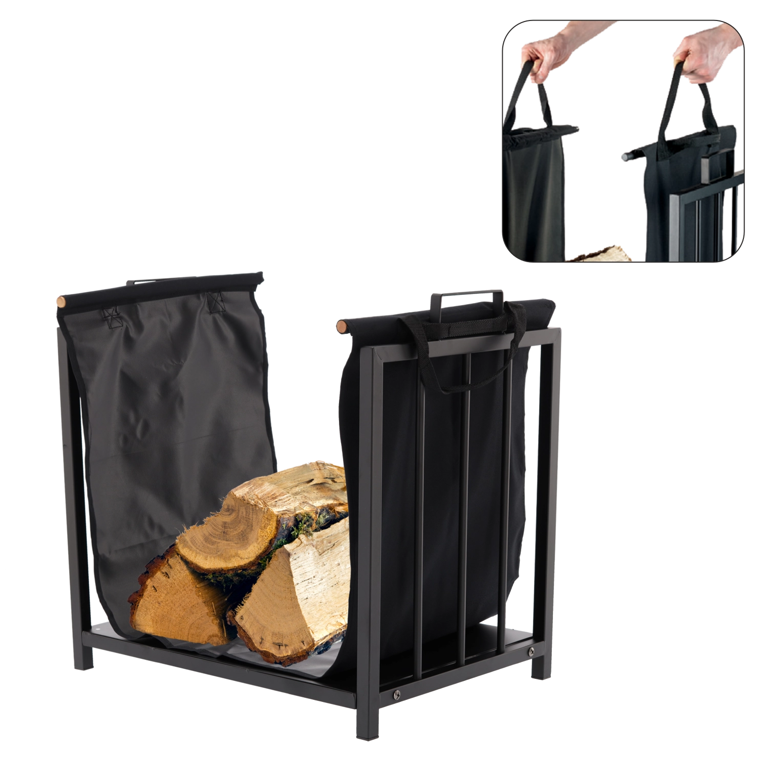 The practical set includes a metal rack and a removable fabric bag with handles for easy carrying. The bag keeps splinters and debris contained, while the sturdy frame keeps logs neatly stored right by the fireplace. Thanks to its compact dimensions of 51 × 37 × 50.5 cm, it also fits smaller spaces.