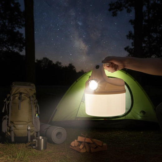 Looking for reliable light for camping, the workshop, or power outages? This 2-in-1 camping LED lamp combines diffused illumination for space with a directional beam for precise lighting. Three lighting modes let you tailor brightness to the situation and conserve battery power.
