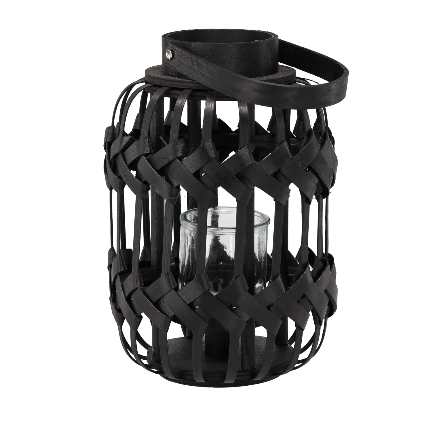 An elegant black lantern candle holder with a woven metal body and a glass insert for a candle brings a cozy atmosphere to both interiors and gardens. Thanks to the practical handle, it’s easy to carry, the open weave beautifully diffuses the light, and the glass protects the flame and wax.