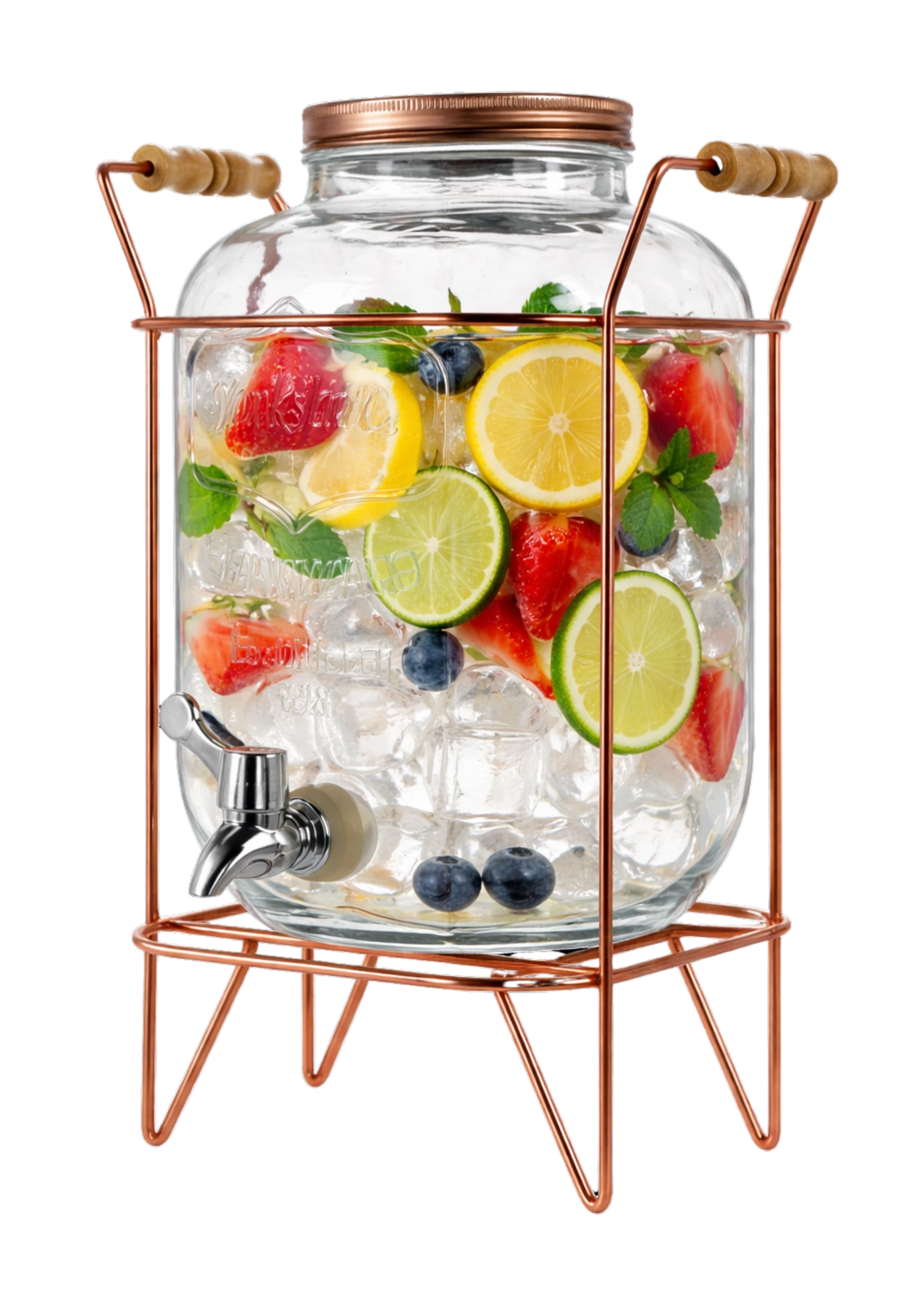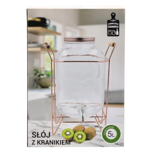 Discover the convenience of self-serve dispensing. This 5-liter glass beverage dispenser features a chrome-plated tap for smooth pouring and a metal stand in a copper tone that raises the container to the ideal height for glasses. The transparent glass with embossed lettering is decorative and also makes it easy to check the fill level.
