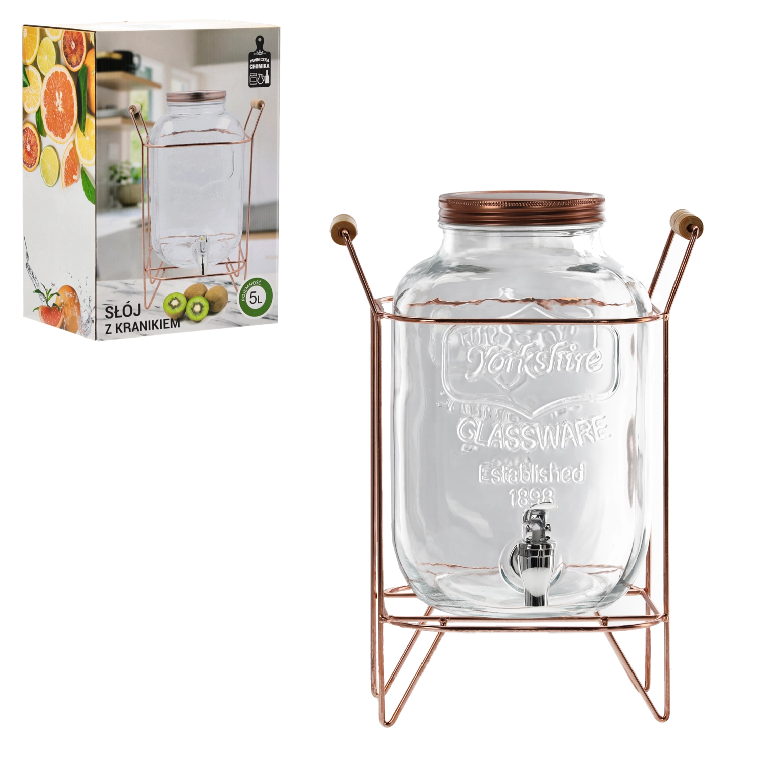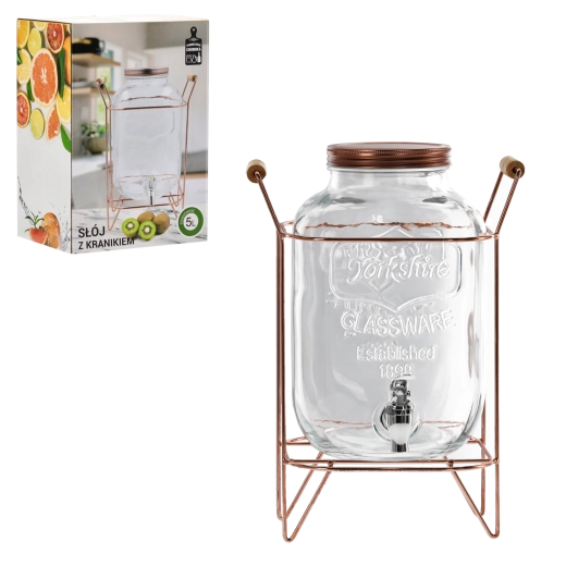 A stylish 5 l glass beverage dispenser with a practical tap and a stable metal stand is ideal for family celebrations, garden parties, and buffets. Thanks to the raised stand, pouring into glasses is comfortable and clean, and the transparent glass with the “Yorkshire Glassware Established 1898” relief gives the container a unique character. Perfect for water, lemonades, juices, and punch – easy serving, elegant design, and reliable stability in one.