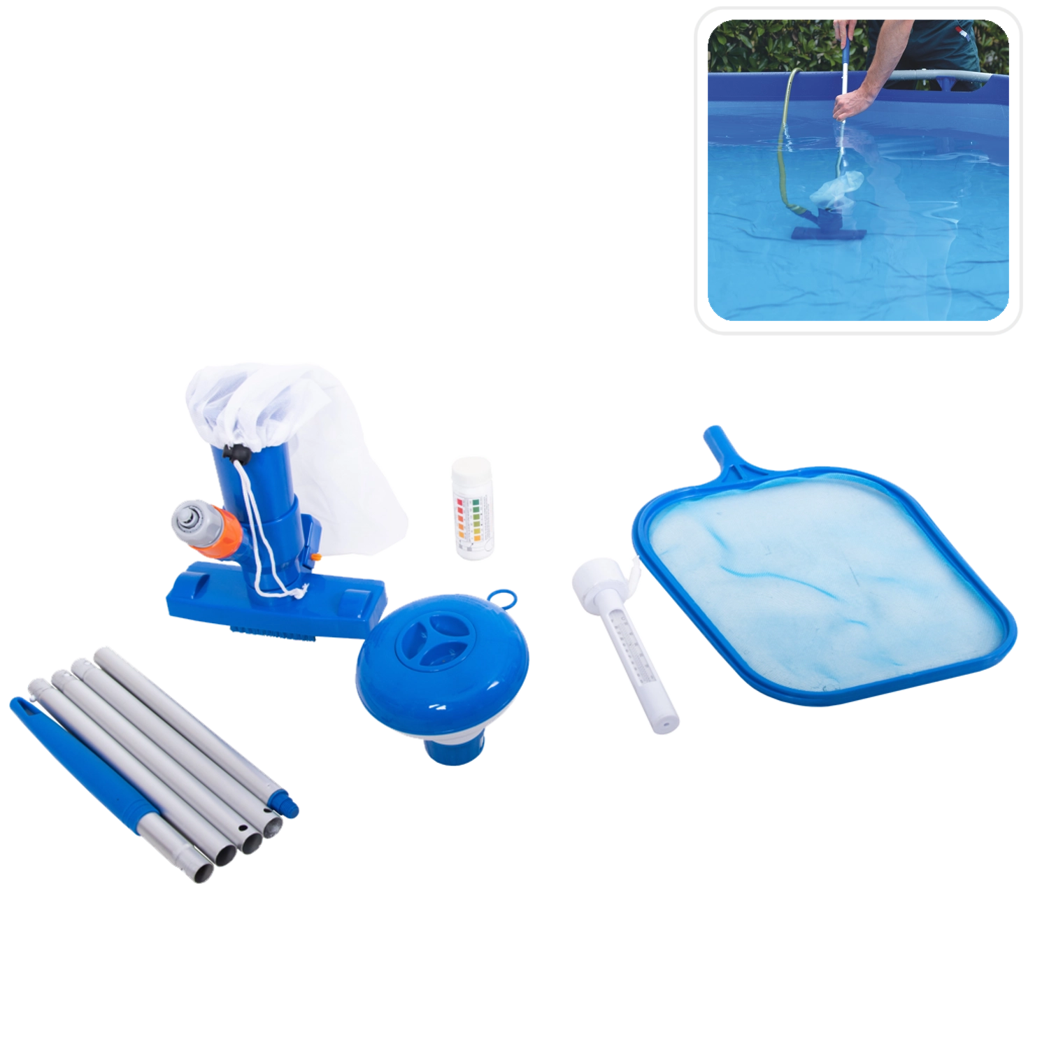 - chemical dispenser, floating thermometer, 3-in-1 test strips, pool vacuum, debris skimmer net, telescopic pole