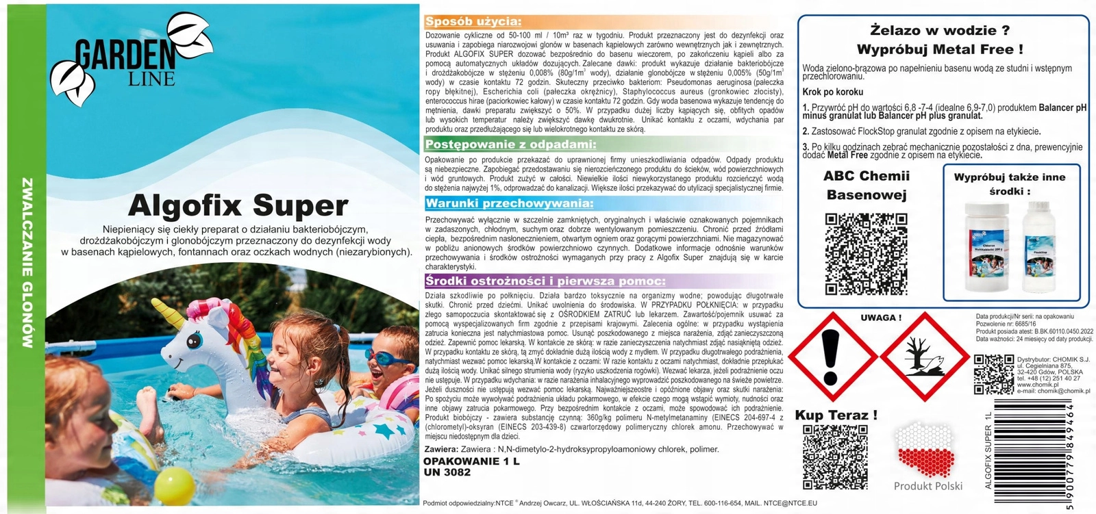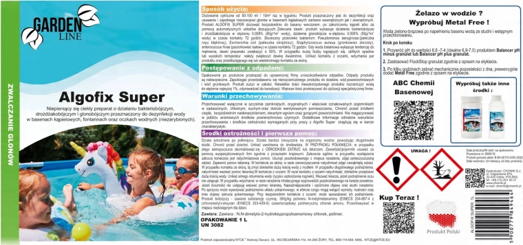 Algofix Super is a modern non-foaming liquid product for comprehensive disinfection of pool water. It effectively eliminates algae, bacteria, and yeasts, keeping the water crystal clear and safe in outdoor and indoor pools, fountains, and fish-free garden ponds. Ideal even at high temperatures and with intensive use without foam formation.