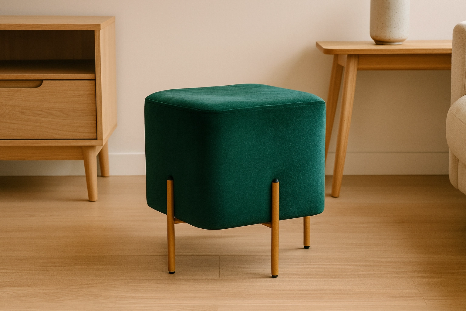 An elegant square ottoman with soft velvet upholstery and stable gold-colored metal legs adds flair and practicality to your interior. It offers soft, comfortable seating, compact dimensions 35 × 35 × 40 cm, and versatile use as a footrest, extra seat, or side table. The sturdy construction and stylish gold details fit perfectly in the living room, bedroom, or hallway.