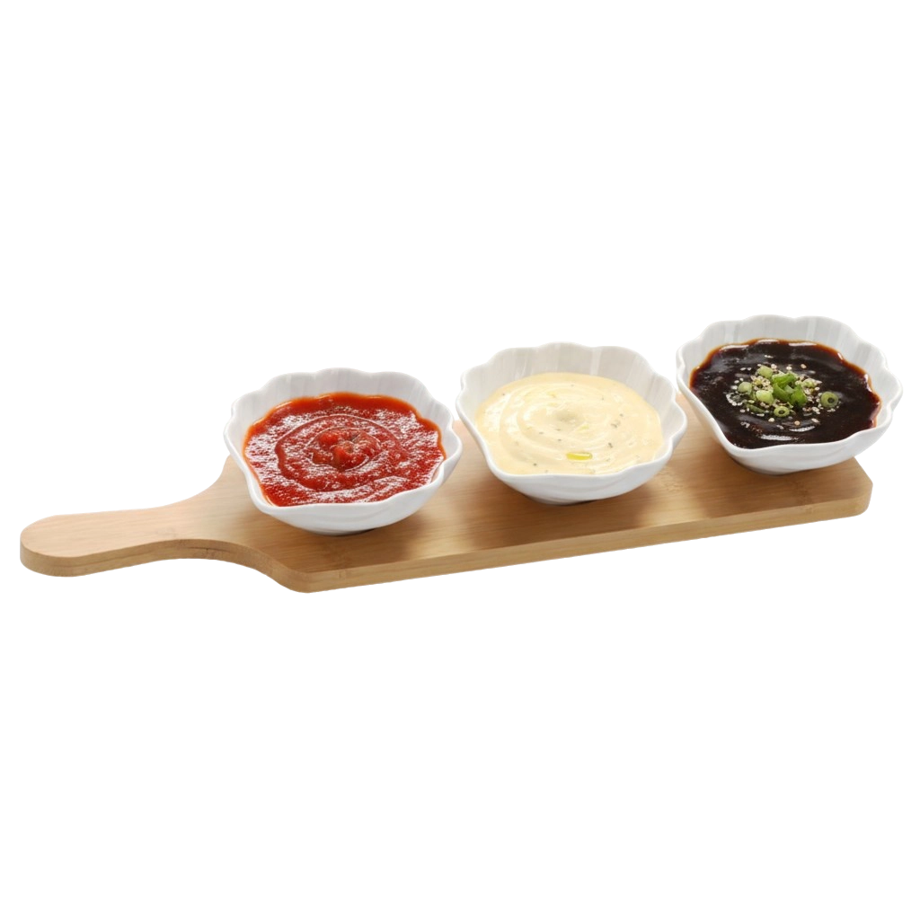 A stylish set of three Kwiat porcelain bowls on a bamboo tray, ideal for serving dips, sauces, and snacks. The floral shape and white color add elegance to any table, while the bamboo tray ensures stability and easy carrying. High-quality porcelain guarantees durability and long life and easy maintenance.