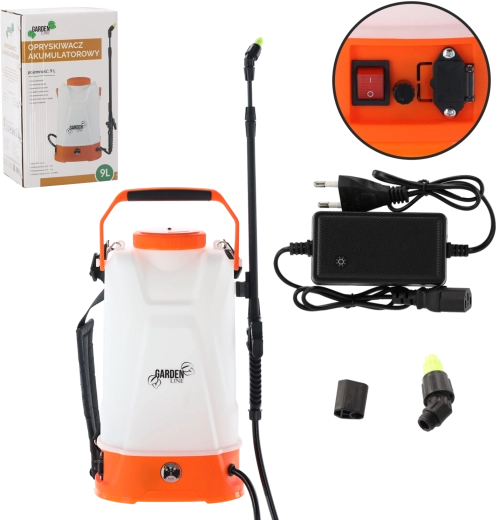 Compact battery-powered sprayer with a 9 L capacity for easy maintenance of gardens, orchards, and greenhouses. Ensures even spraying against diseases and pests, features an adjustable nozzle, a long spray wand, and a comfortable shoulder strap for easy carrying. Thanks to the 12V battery and 0.1–0.3 MPa pressure, it operates efficiently with minimal effort.