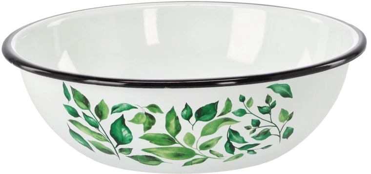 A practical and elegant enamel bowl with a capacity of 2.5 l and a diameter of 24.5 cm in white with a ficus motif. Ideal for everyday use—from mixing batter to serving salads. The durable enamel surface is hygienic, easy to clean, and does not affect the taste or aroma of food. Thanks to its resistance to both high and low temperatures, it offers wide versatility in any kitchen.