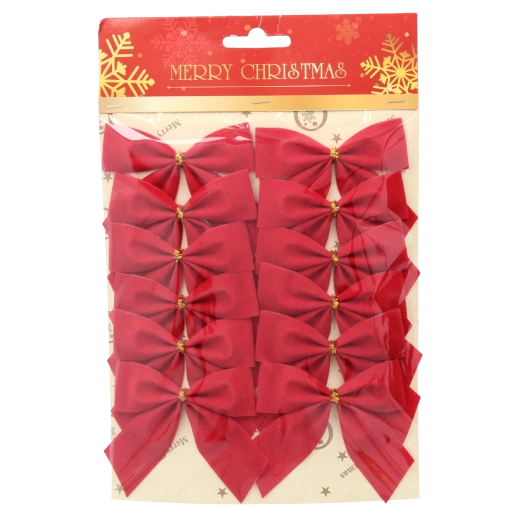 An elegant set of 12 Christmas bows in red and white adds a festive atmosphere to your decorations. High-quality textile with a soft velvet texture looks luxurious, and the practical wire ensures quick and secure attachment to the tree, wreaths, and gifts.