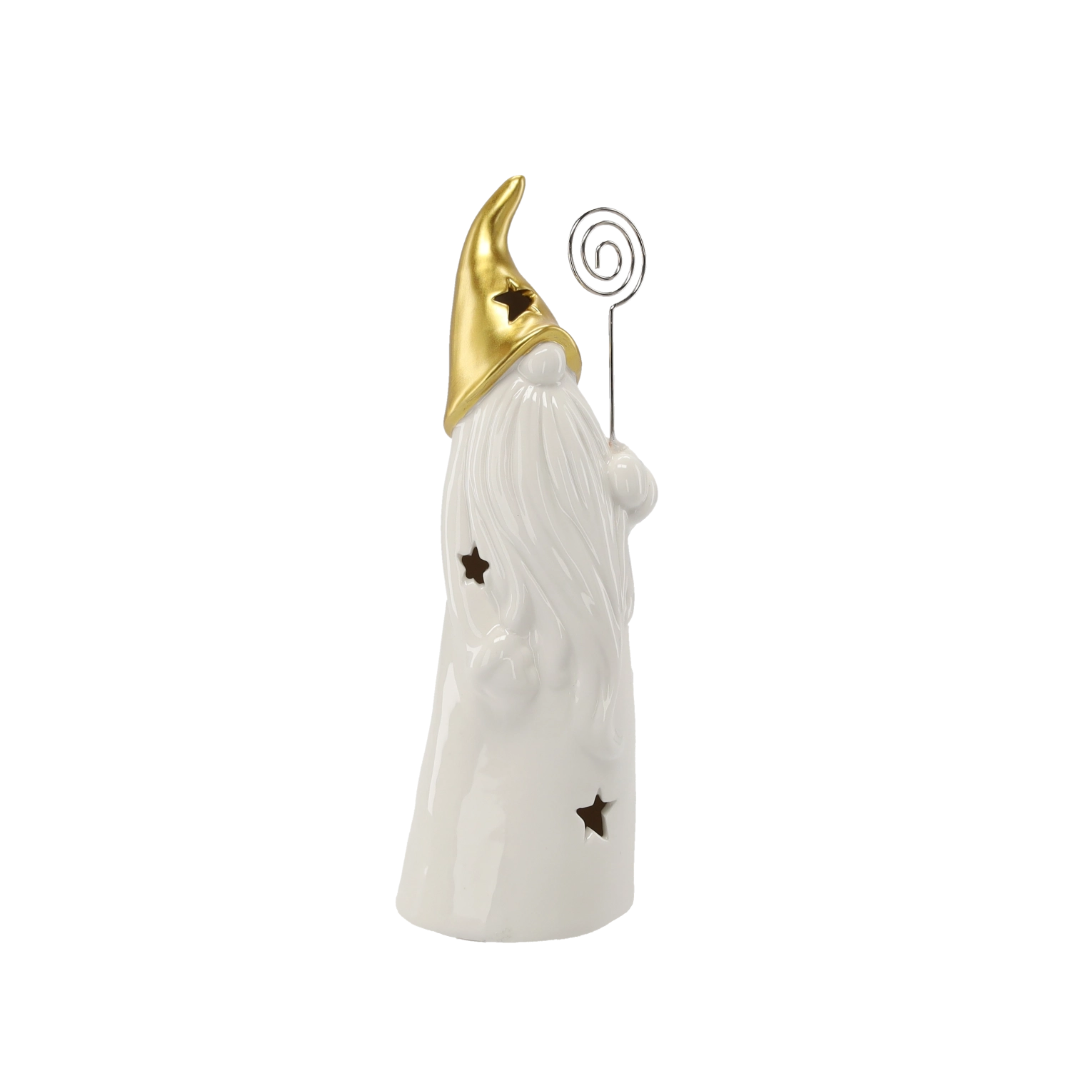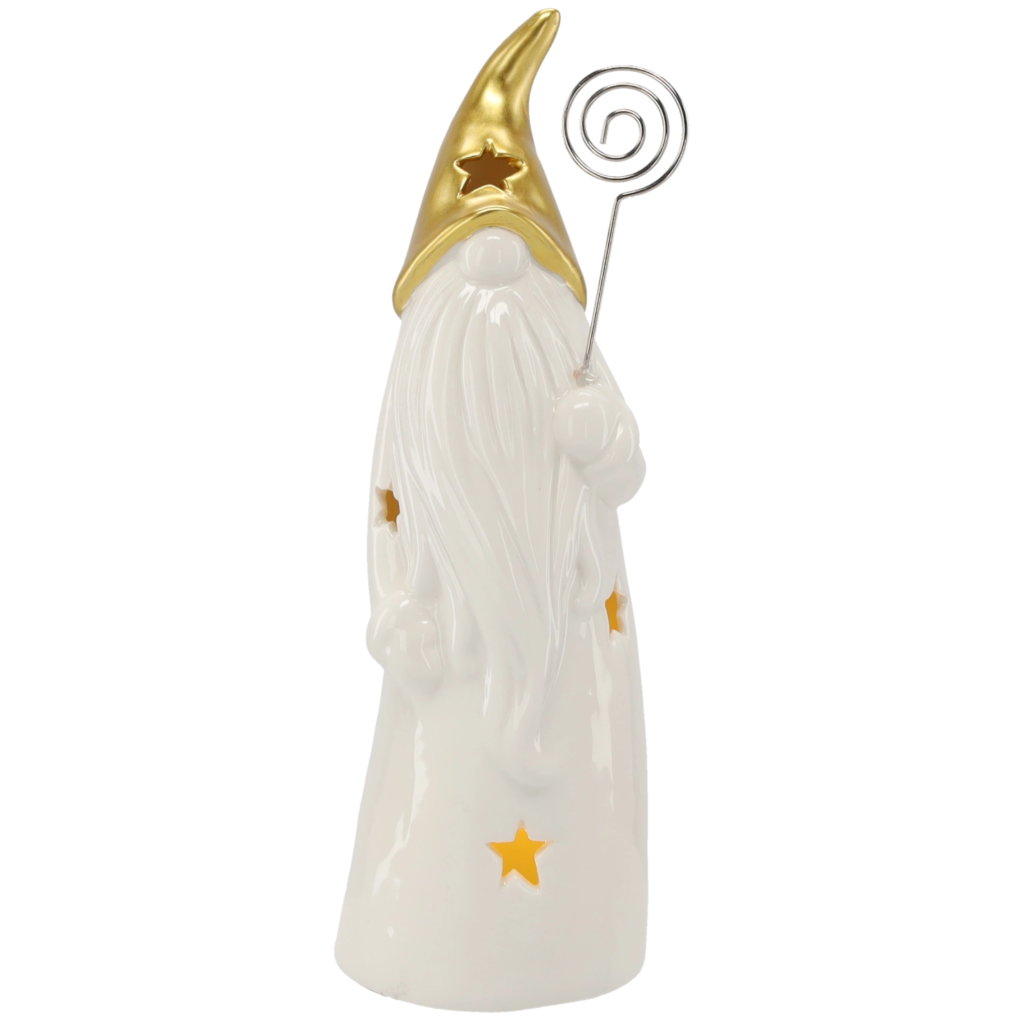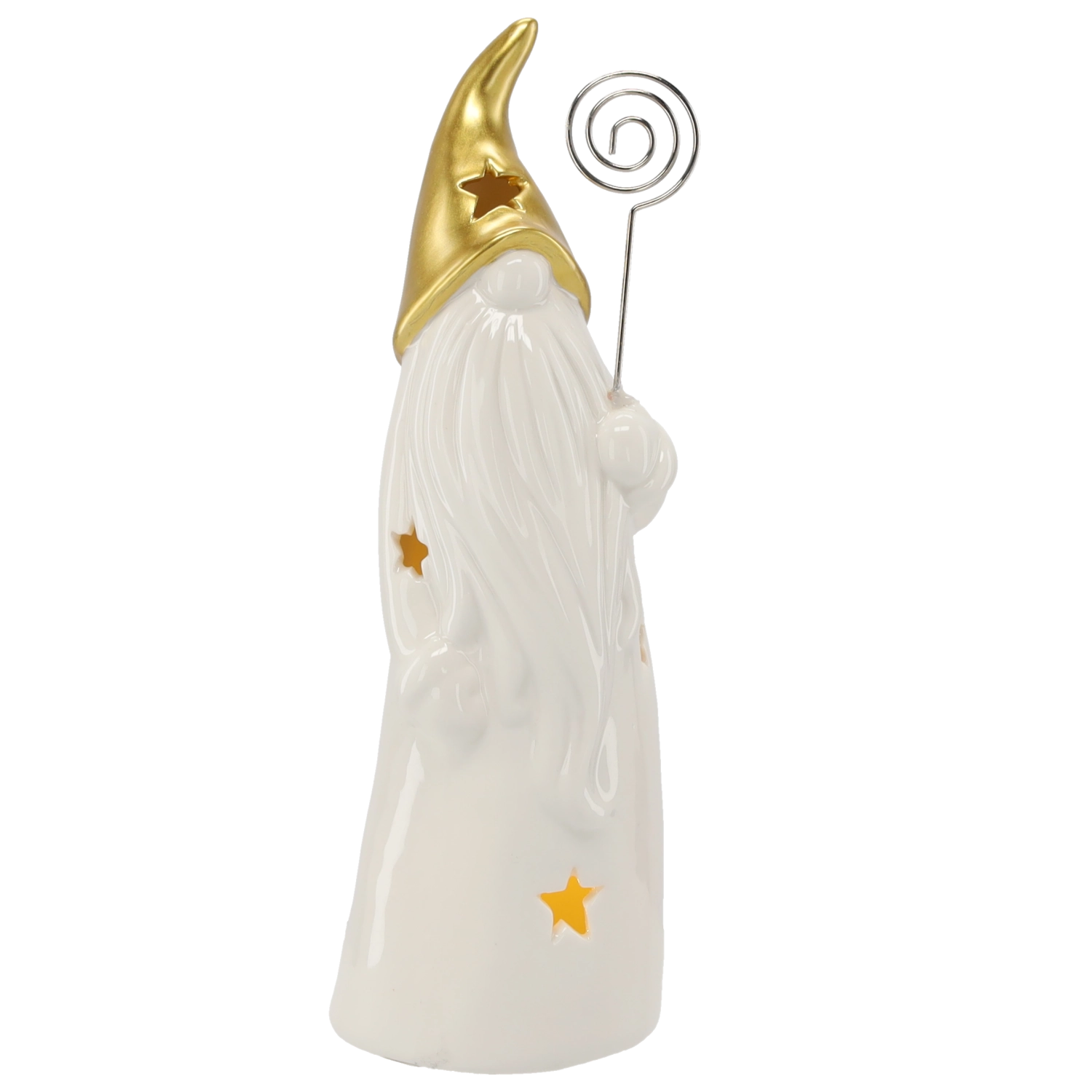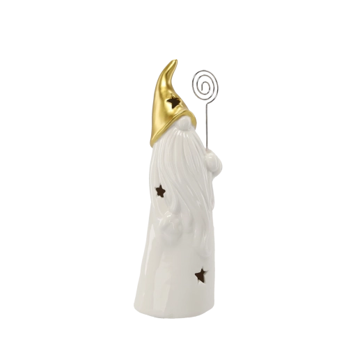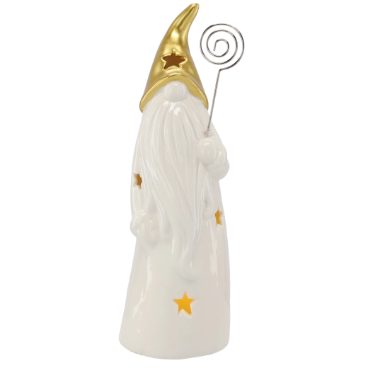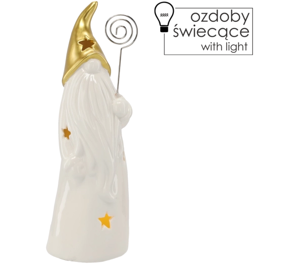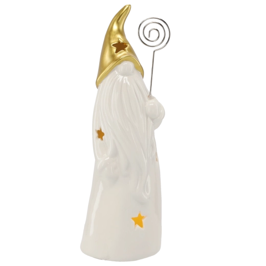 Decorative ceramic wizard figurine with a gold pointed hat, long white beard, and star-shaped cutouts that create a gentle ambient glow when lit. Includes LED lighting powered by batteries (included), ideal as a Christmas or year-round decoration for a table, sideboard, or windowsill.