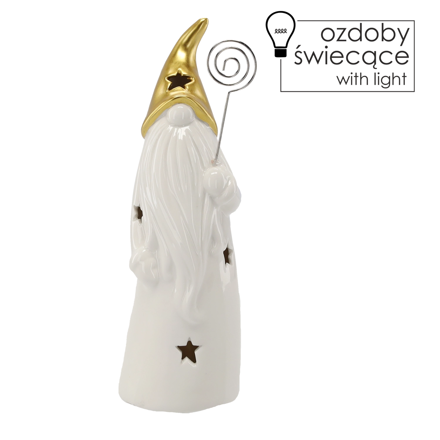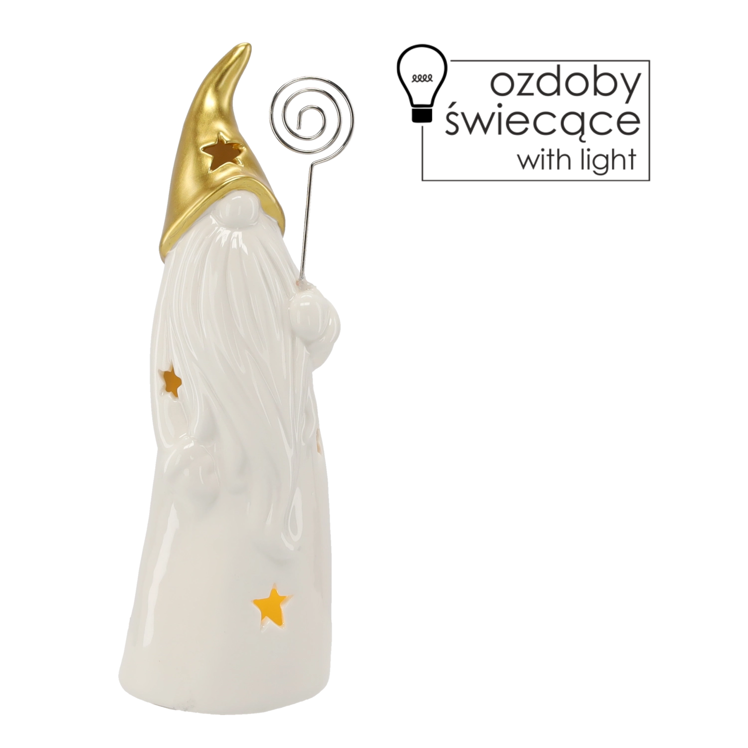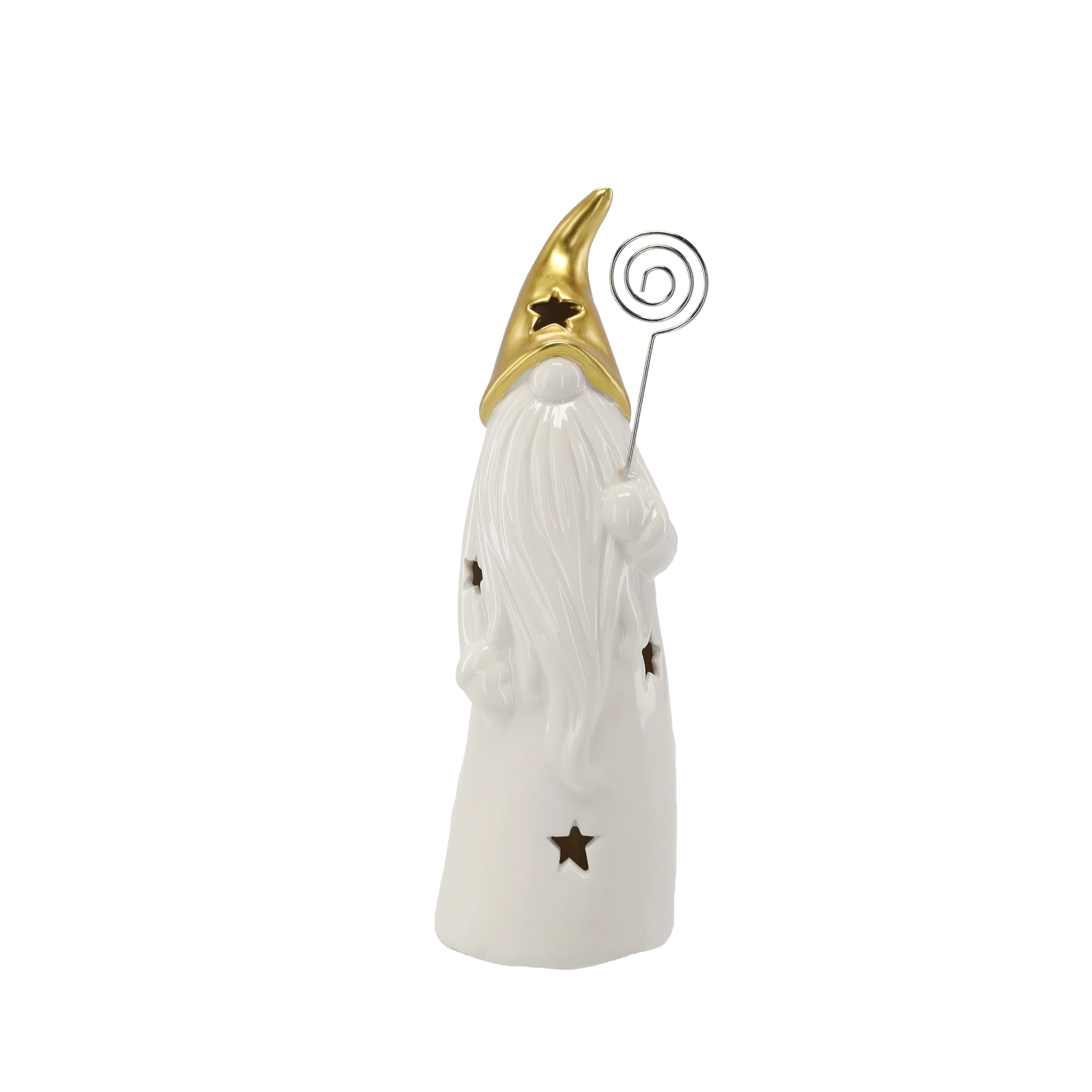 Decorative ceramic wizard figurine with a gold pointed hat, long white beard, and star-shaped cutouts that create a gentle ambient glow when lit. Includes LED lighting powered by batteries (included), ideal as a Christmas or year-round decoration for a table, sideboard, or windowsill.