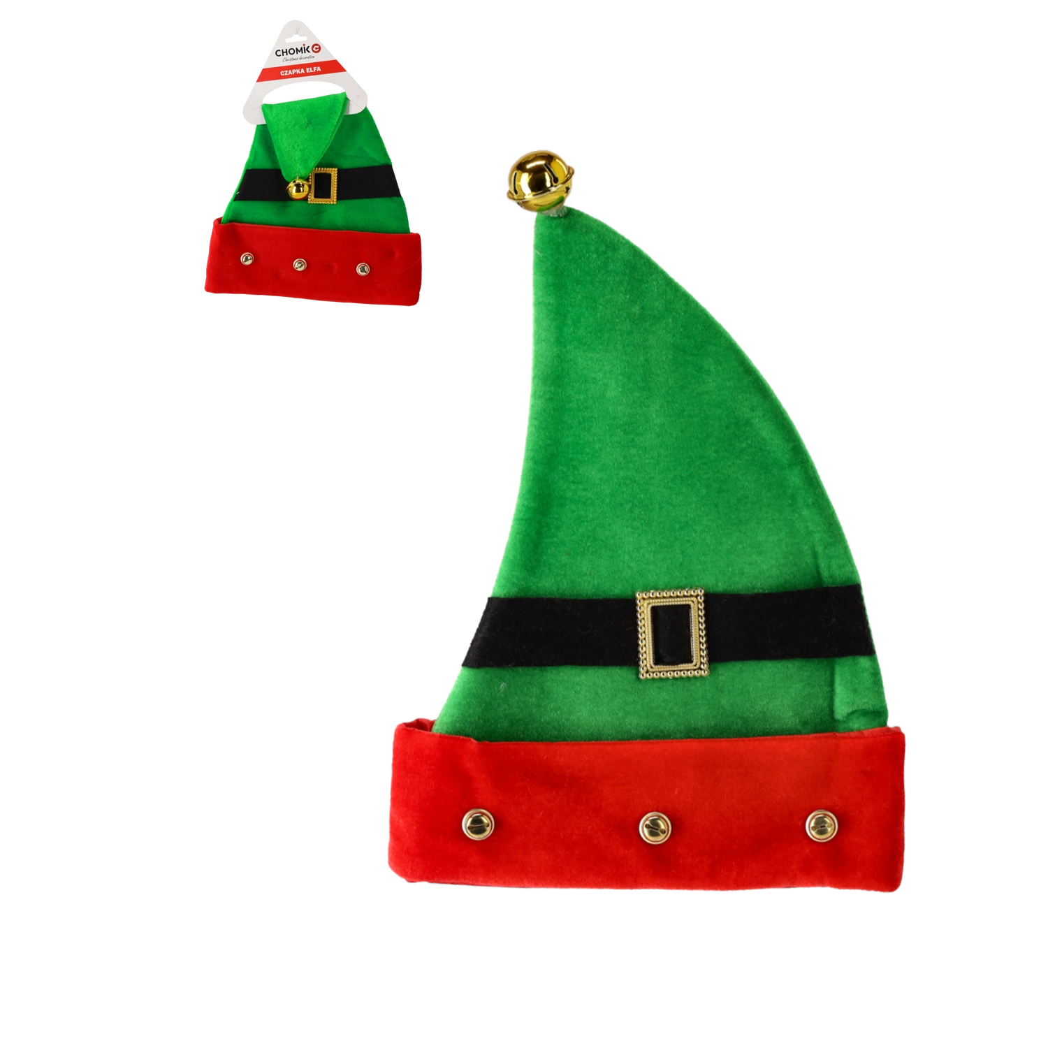 • Bold design: green-and-red panels, belt with buckle, and bells.