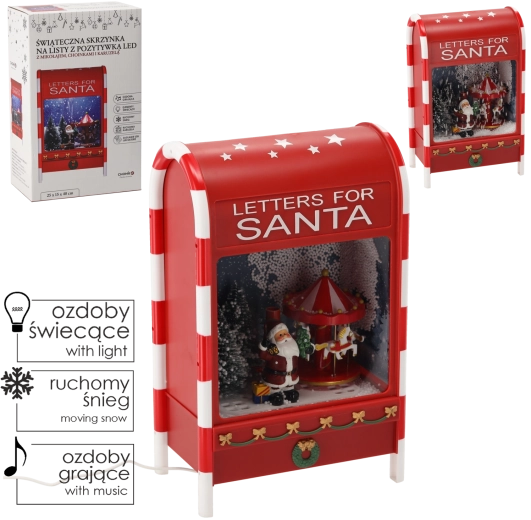 This decorative red mailbox is an impressive Christmas accent with rich visual and audio effects. Cool white SMD LEDs enhance the winter ambience, while the scene with Santa Claus, trees, and a carousel creates a magical moving display. The snowfall effect adds an authentic festive mood.