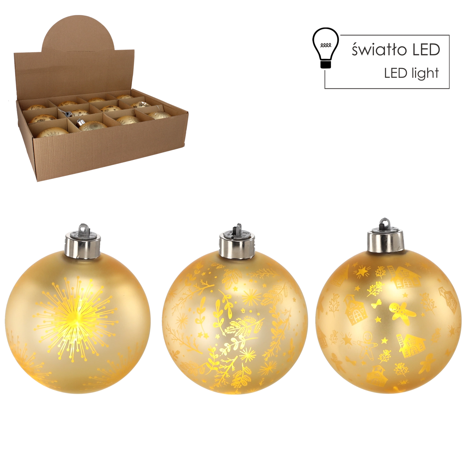This golden glass Christmas bauble creates a cozy, warm glow thanks to its subtle LED lighting, enhancing the festive mood. The decorated surface stands out beautifully when lit, adding a luxurious touch to your space. Its versatile golden color pairs easily with red, green, and white decorations.