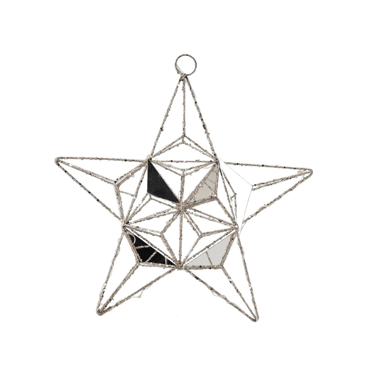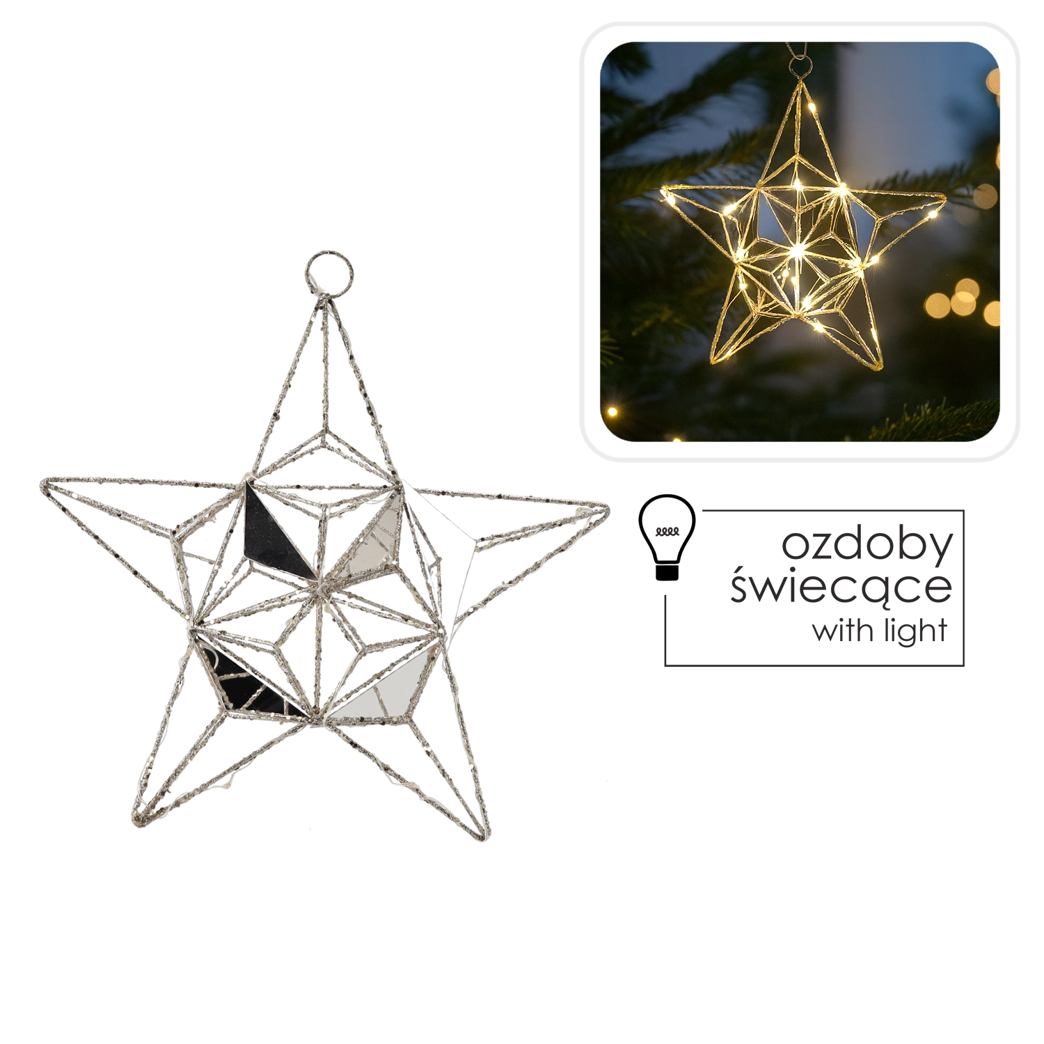 This elegant Christmas star with integrated energy‑saving LEDs creates a cozy atmosphere and a gentle sparkle. The metal wire construction with faceted elements and mirrored surfaces reflects light, giving the decoration a luxurious look.