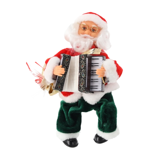 A charming Christmas SANTA figurine in a traditional red coat and green trousers turns any interior into a festive scene. Santa plays music, moves the accordion, and his LED sack gently glows, creating a cozy atmosphere at home or in the office.