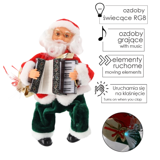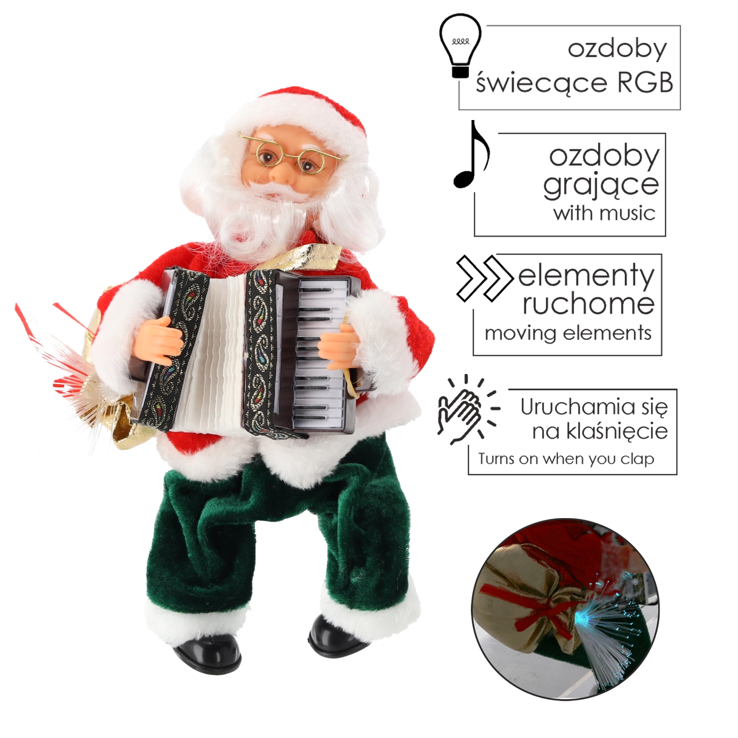 Bring Christmas magic home with a SANTA figurine that plays cheerful melodies, moves his hands and accordion, and features a lit LED sack. Thanks to sound activation, just clap and Santa comes to life – an ideal decoration for a table, sideboard, or shop window.