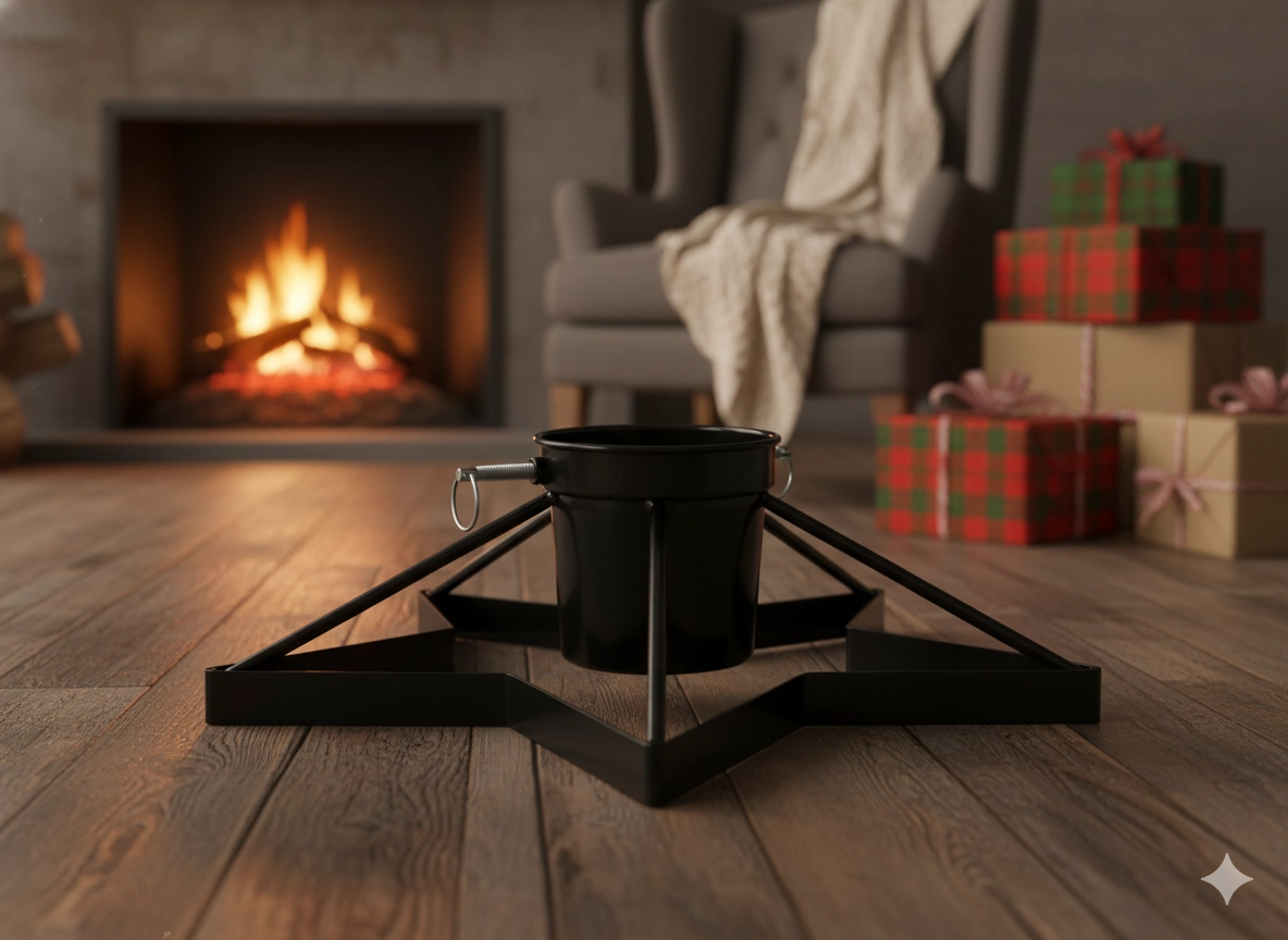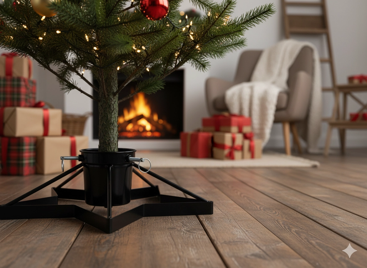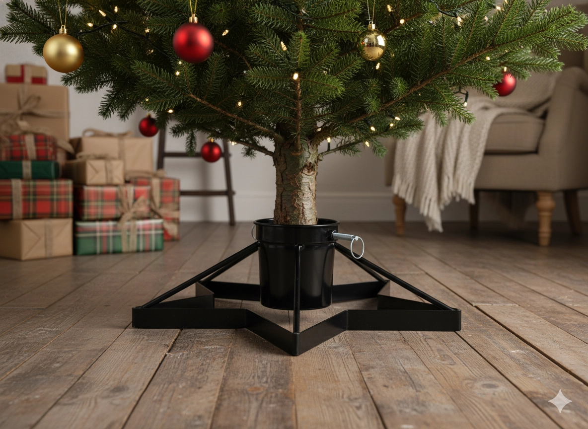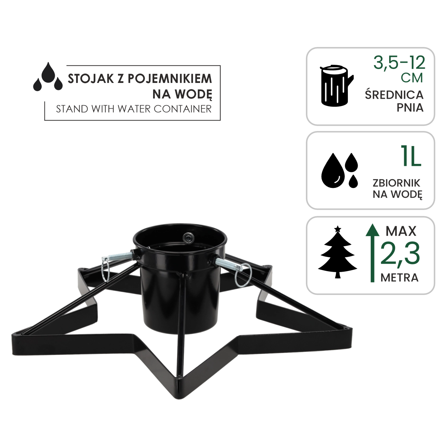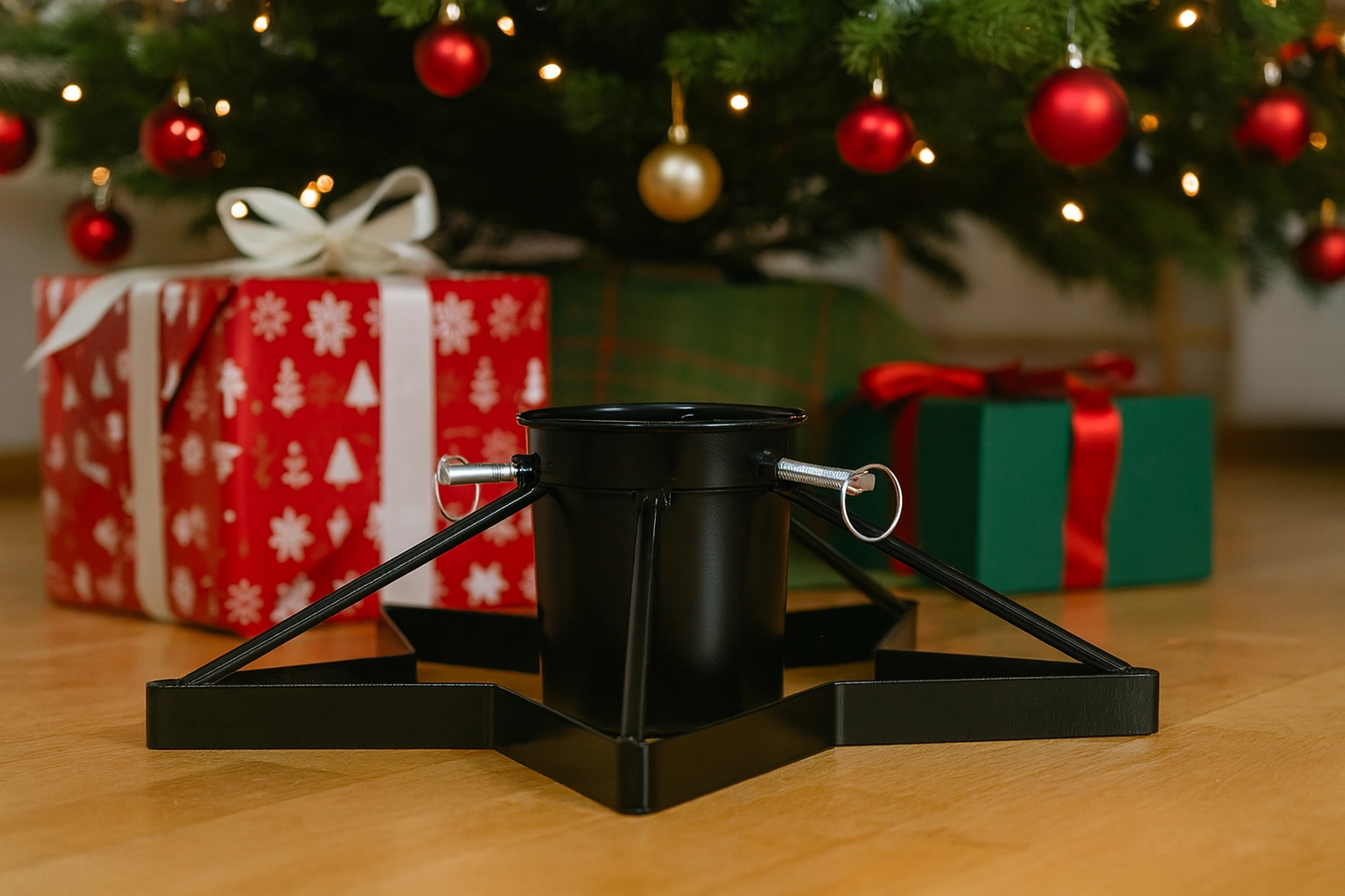 Secure the tree using adjustable screws that accommodate trunk diameters of approximately 35–120 mm. The integrated water reservoir (approx. 1 L) makes upkeep easier and reduces needle drop. The minimalist black finish looks elegant and timeless.