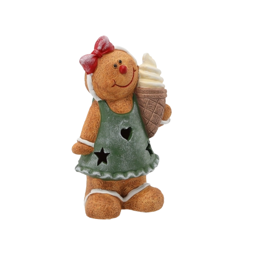 A charming Christmas figurine of a gingerbread man with integrated LED lighting brightens up any interior. Thanks to its compact size, it fits perfectly on a shelf, sideboard, or festive table. Warm LED light, ceramic construction, and ready-to-use convenience with included batteries create a cozy holiday atmosphere.