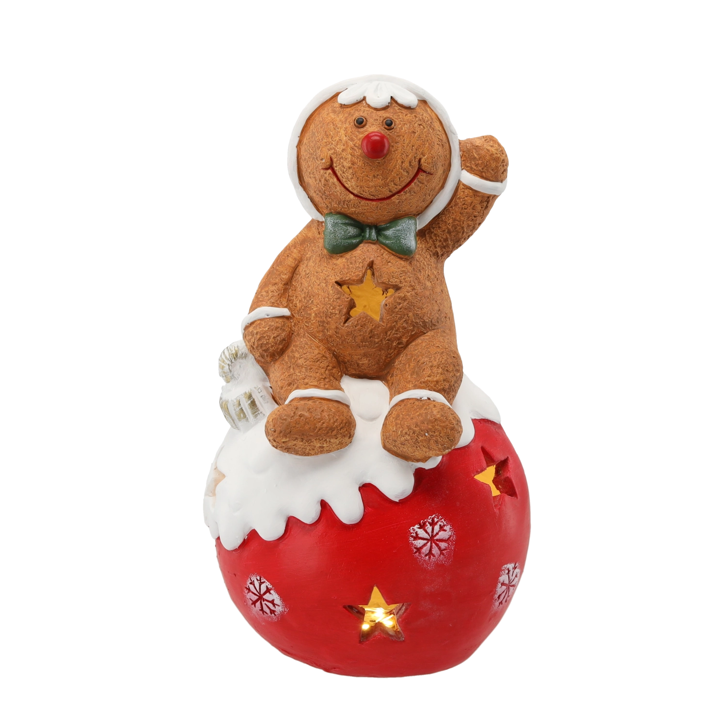 A cute Christmas decoration featuring a gingerbread man sitting on a decorative bauble brings a magical atmosphere to your home. The integrated LED lighting creates a warm effect, while the durable magnesite ceramic material ensures stability and long service life. Ideal as holiday decor for a shelf, sideboard, or windowsill.