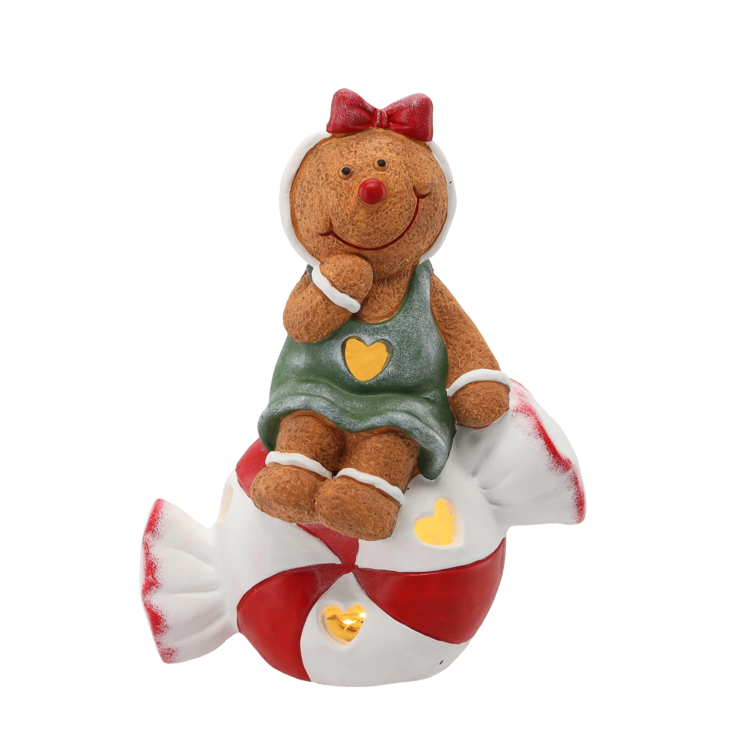 A cute Christmas figurine of a gingerbread man sitting on a candy with integrated LED lighting will brighten your home. The combination of detailed craftsmanship, a warm light effect, and durable material ensures an impressive decoration for a shelf, windowsill, or festive table.