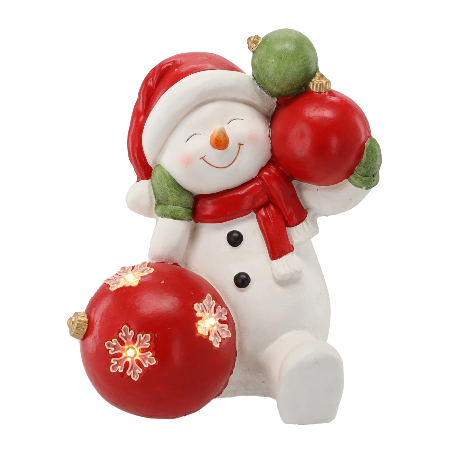 This finely crafted Christmas snowman figurine with baubles brings a warm festive atmosphere to your interior. The gentle LED light highlights the decor and creates pleasant light accents during long winter evenings. Thanks to the robust magnesia material, the decoration is stable and durable.