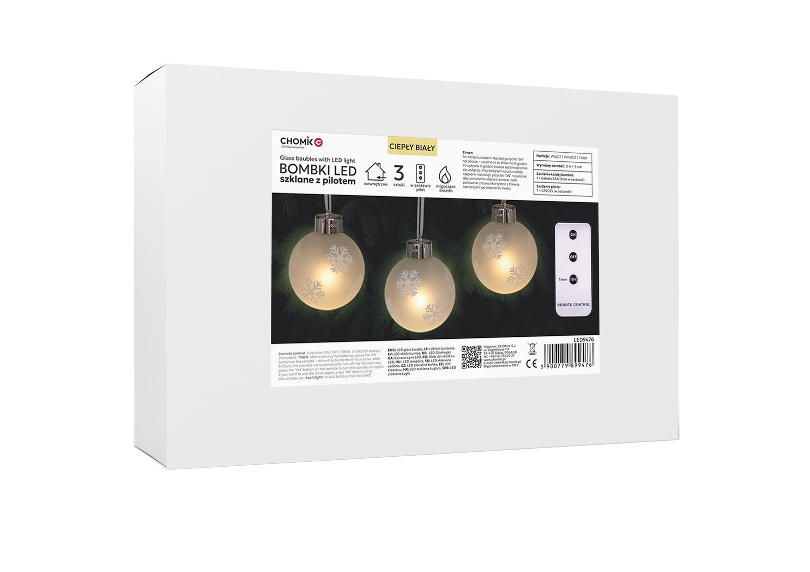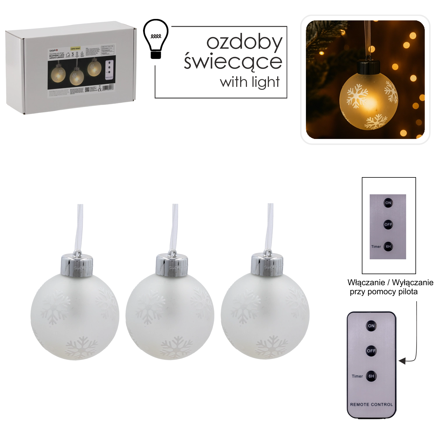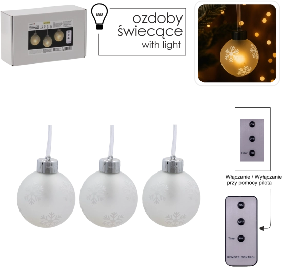 Create a magical holiday atmosphere at home with a set of three glass Christmas baubles featuring a delicate snowflake pattern and warm LED light. Thanks to the remote control with timer and battery power, the decoration is easy to operate, safe, and ready to use instantly anywhere on the tree, shelf, or table.
