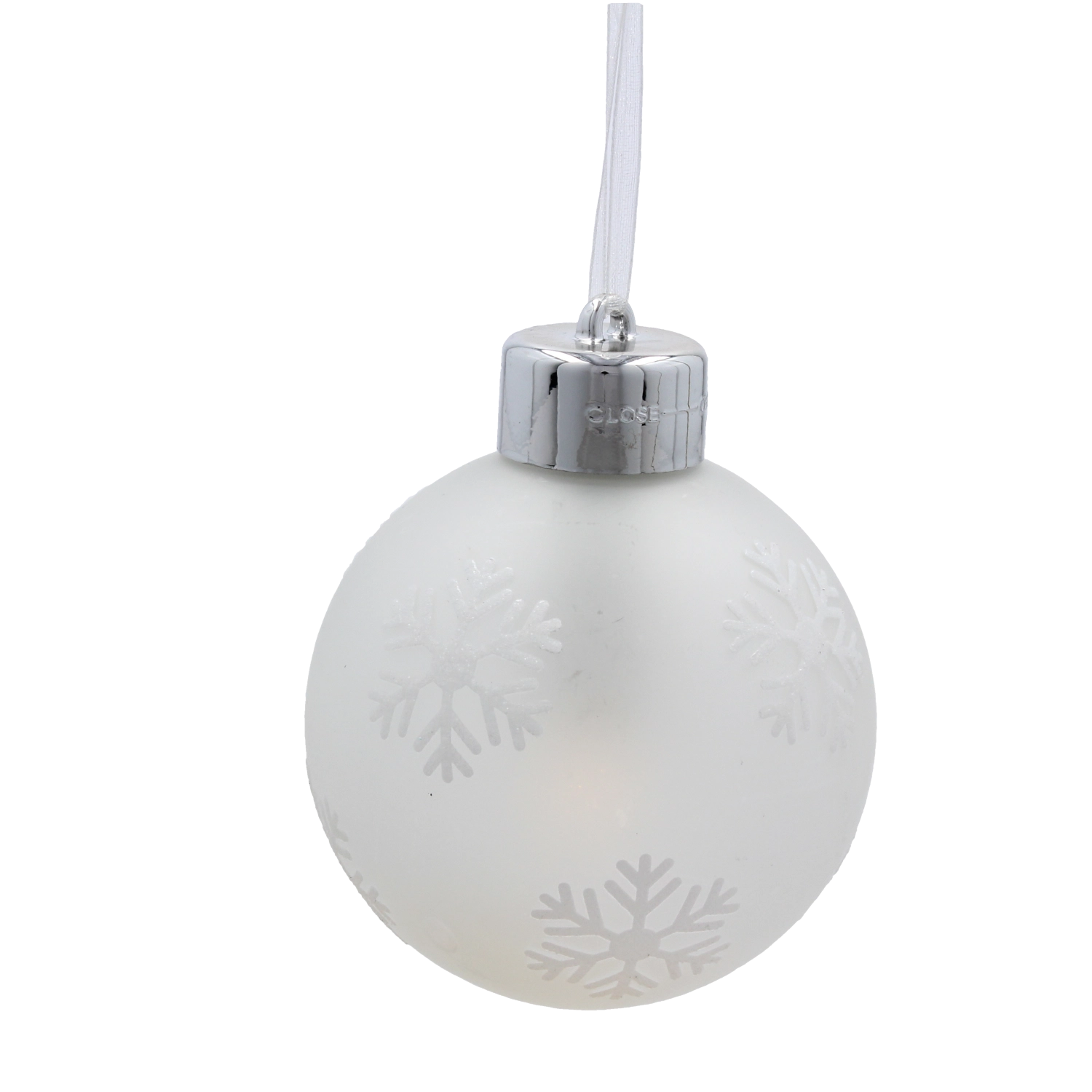Elegant glass baubles with a frosted finish and snowflakes will brighten your tree and interior with a pleasant, warm light. Integrated LEDs create a cozy glow with a subtle sparkle that enhances your Christmas decor without the hassle of cables.