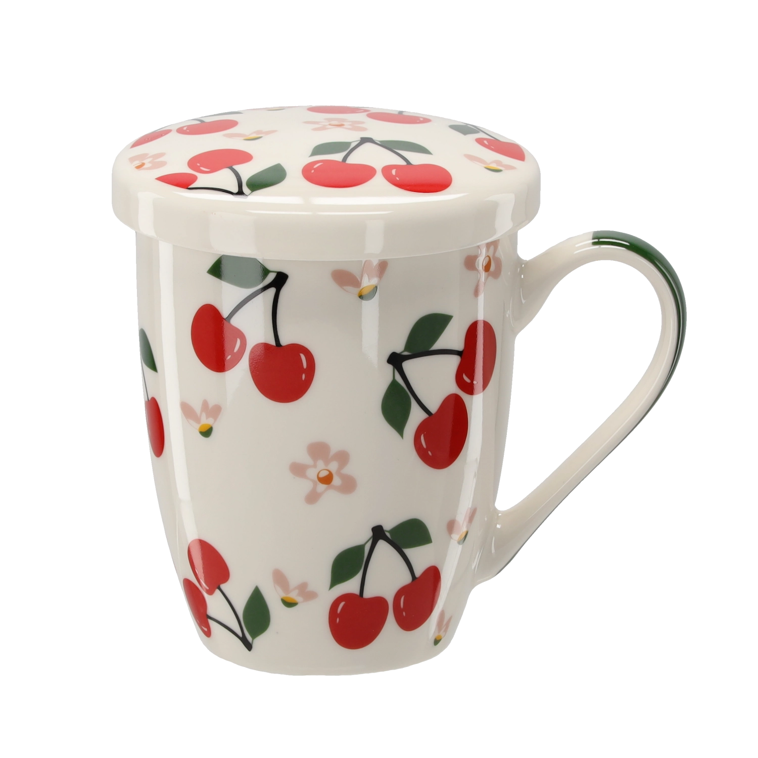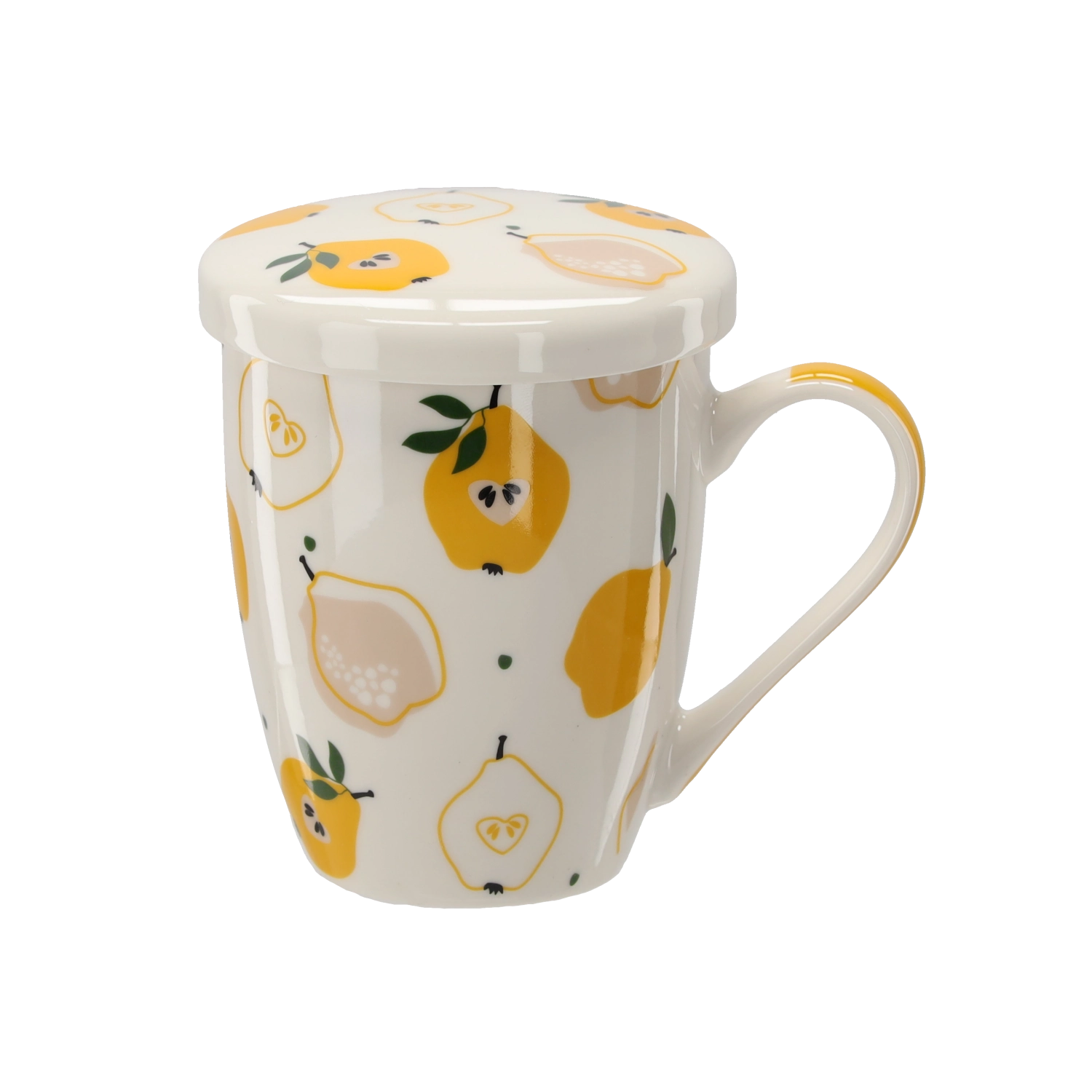 A stylish 340 ml porcelain mug with an integrated strainer and lid, ideal for everyday tea and herbal infusions. Thanks to the fine strainer, you can prepare loose-leaf tea without residue, while the lid keeps your drink warm longer. High-quality porcelain, an ergonomic handle, and fresh fruit motifs make it a practical and beautiful addition to your kitchen.