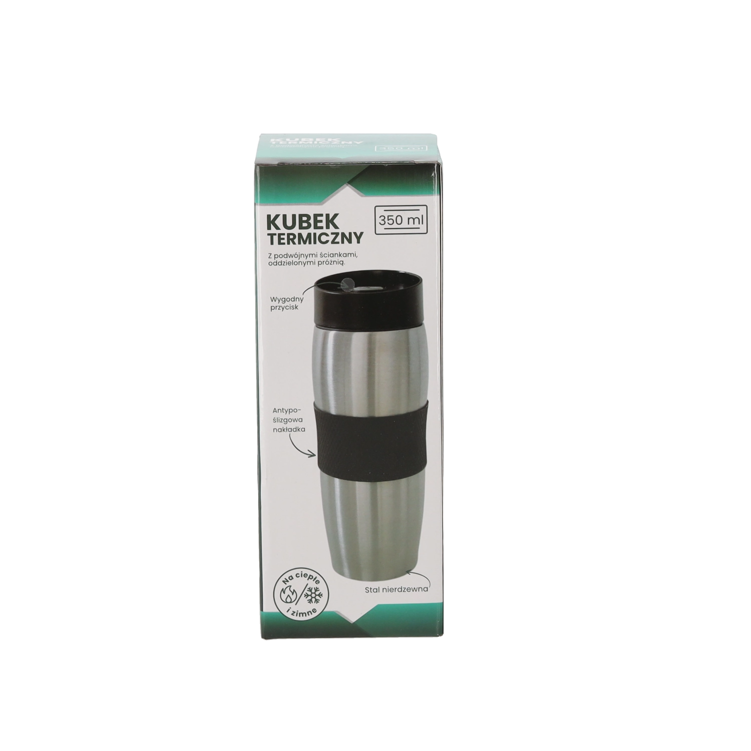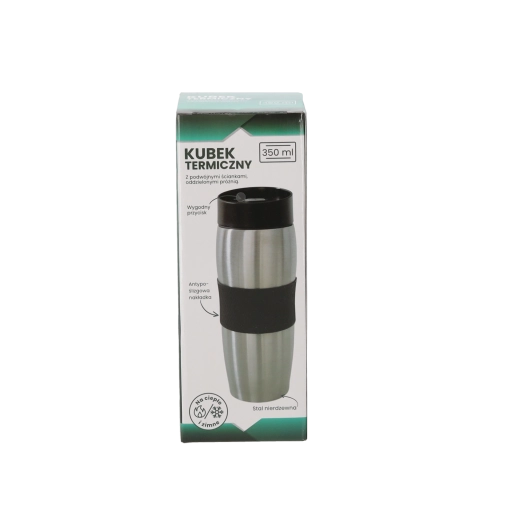 Practical 350 ml travel mug made of durable stainless steel with double-wall insulation, a non-slip silicone grip, and long-lasting temperature retention – ideal for coffee or tea on the go.