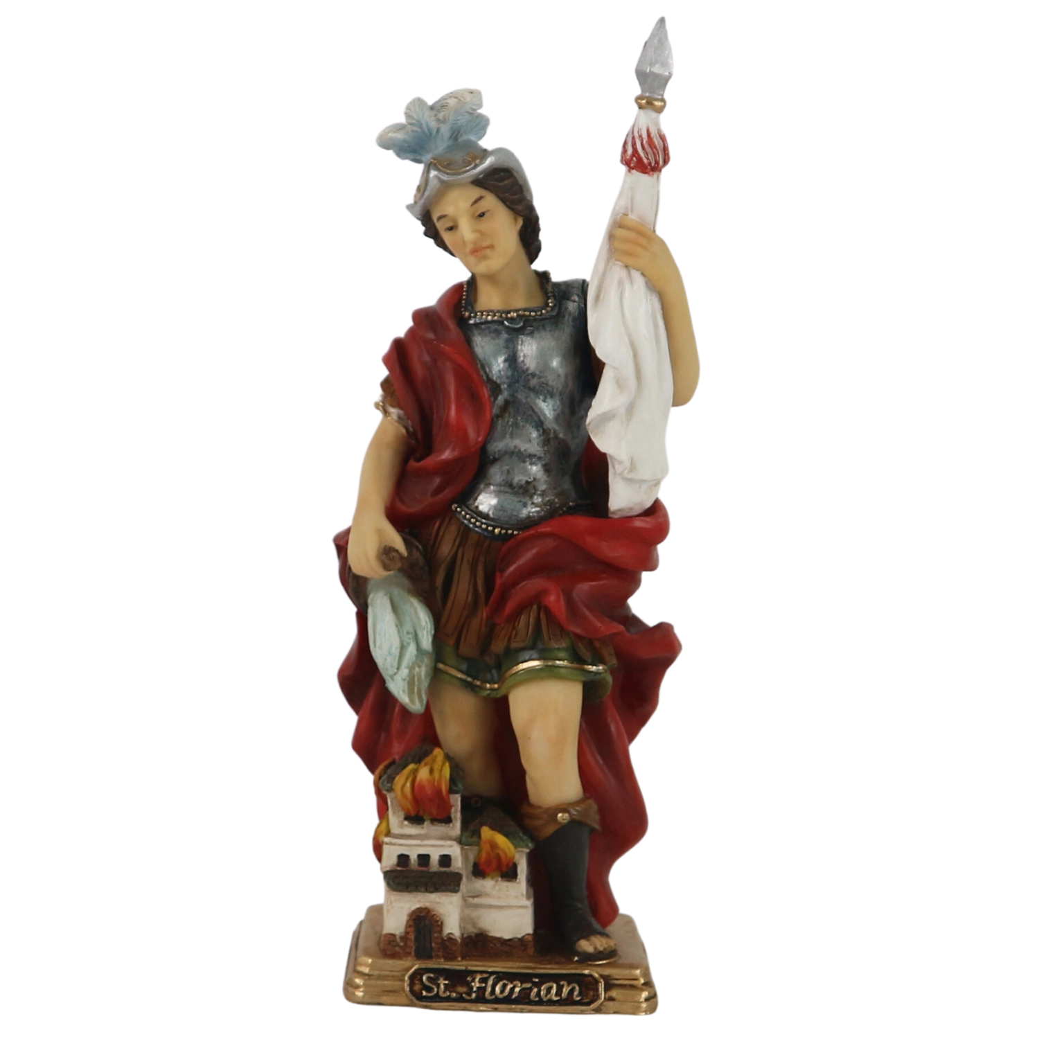 The statue of St. Florian in armor with a cloak and banner stands out with hand painting and carefully modeled details that give the figure expression and depth.