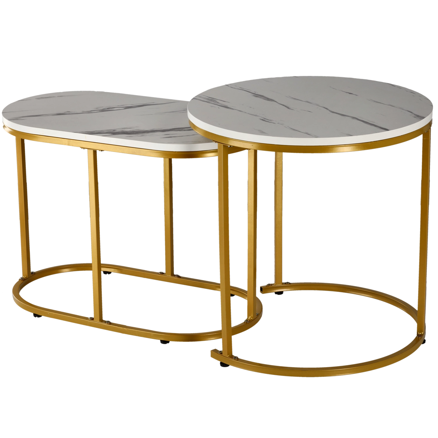 This two-piece set includes a larger round table and a smaller oval table that can be used together or separately. The durable metal base with a gold finish provides stability, while the smooth white marble-effect tops are easy to clean and look luxurious.