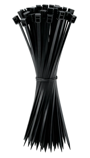 Black nylon cable ties measuring 2.5 × 100 mm are ideal for quick and secure bundling of cables, hoses, and other components. Thanks to a special material composition with UV protection, they withstand demanding outdoor conditions. The material meets the UL 94 V2 flammability rating, is self-extinguishing, and suitable for safe use in electrical engineering and industry.